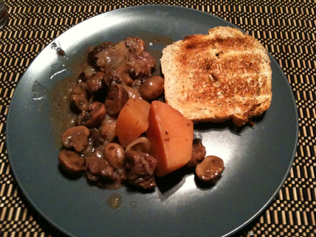For dinner, we had a modified version of the boeuf bourguignon recipe I had found on Recettes du Québec (www.recettes.qc.ca). The original recipe, that I have tried and enjoyed many times, was meant to be cooked in the oven for two hours. As I had to leave for work at noon and didn’t want to have dinner after 8pm, I made the same recipe in the slow cooker. I had to double the quantity of liquid. I also added potatoes as I knew Jeff would appreciate the thought. The result was pretty good. Once again, I had a slice of toasted bread to accompany the dish…I just love the homemade bread!