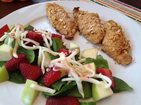 For dinner, I had first planned to make chicken tacos but plans changed and I didn’t want to make such a big meal if my husband wasn’t going to eat it as well. So I had to come up with another leftover meal. I knew I would eat the fish fillets leftover from the night before but what with? I had already used all the extra rice with my lunch. So I decided to make a quick salad. Nothing fancy or requiring a recipe. Just spinach, strawberries, apples, grated mozzarella, and a dash of raspberry dressing. It turned out to be a better meal than I first expected it to be! The fish fillets were surprisingly good after being reheated! I didn’t think I would like it as much but it was almost better than when I first baked them.