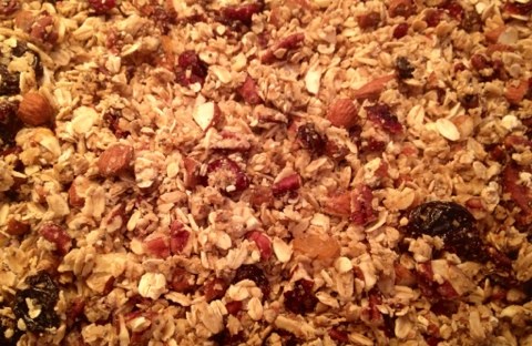 In the last few years, I’ve grown to love granola. Cereal doesn’t sound as good anymore. Most kinds make me feel like I might be getting fiber and sugar but not much else. Meanwhile, granola usually has nuts and dried fruits, and therefore offers a much better breakfast option. I started my little obsession two years ago, we signed up for the Horse & Buggy Produce Share. Every other week, we’d received a gigantic amount of locally made granola. We ended up getting so much more than I could eat that I gave several pounds of it to my mom on some of her visits. After having the H&B real deal granola, anything I could buy at the store tasted like there was way too much sugar and unnecessary ingredients. Recently, I found some maple and walnut granola at the Cheese Shop. The taste was perfect but I couldn’t help and think that I could probably make it myself. That’s when I remembered (duh!) that I made granola for our last Christmas baskets!