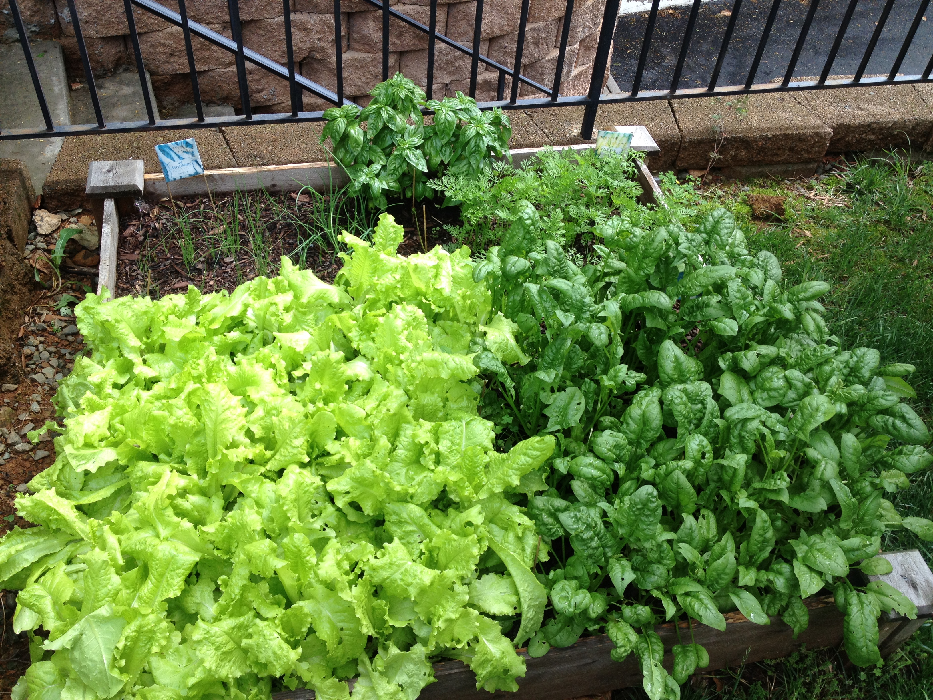 s us to this year’s garden. At the beginning of the season, we still weren’t sure if we’d be traveling a lot over the summer so I didn’t want to start a garden project that would be too demanding. While browsing the dollar store, I found packs of seeds at 4 for $1! I figured it would be good enough for this summer. I got spinach, lettuce, spring onion, and carrot seeds. I separated the garden in four parts (which I had not done the year before) and planted the seeds. It didn’t take long that little plants started growing! Meanwhile, once we realized that we’d be home more than we first expected, I also bought a small tomato plant at C’ville Market and I also bought an Indian chili pepper plant at Gibson’s Grocery. I bought the peppers for two reasons: 1. I had never tried growing peppers before, and 2.The profits were helping some local children go to summer camp. A few weeks ago, I added to my gardening project when I stopped by Southern States and bought basil, rosemary (2 kinds), lavender, and mint. The basil is the only thing I added to the seeds I had originally planted it the garden. Everything else went it separate pots to avoid having a messy garden like last year. So now, our lettuce and spinach are growing out of control but thankfully, it’s nowhere near as messy as the tomatoes were. It’s just green. Very green. And now you also know why almost all of my latest recipes involved spinach. 🙂