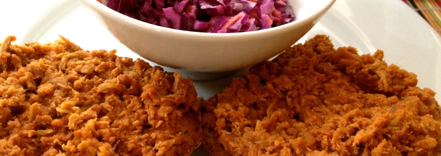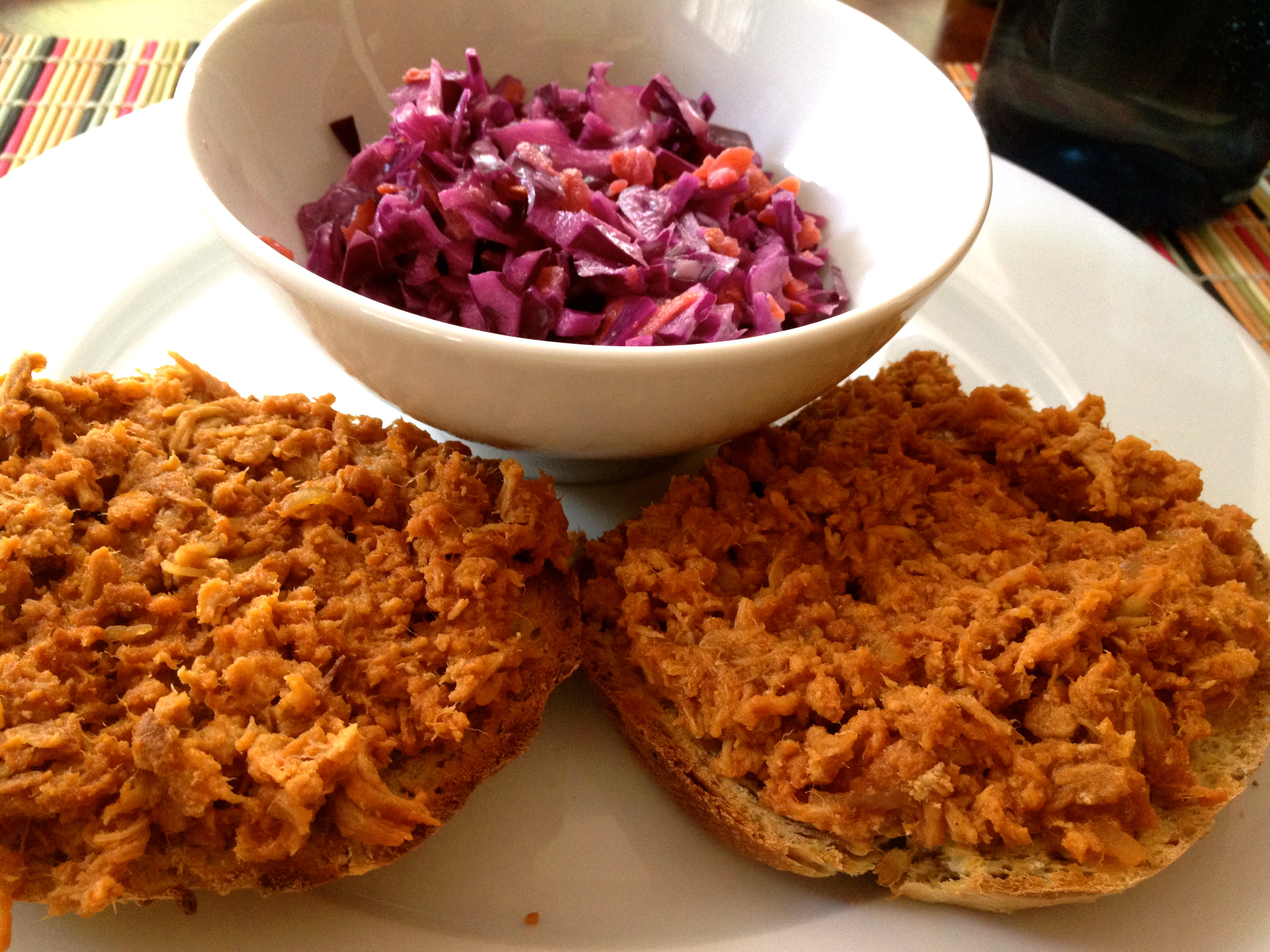 On Saturday evening, we were both exhausted and wanted greasy food BADLY! I ended up driving to a local burger joint to get some take-out. I convinced myself that a hamburger with lettuce, mushroom and tomato would be good enough until I noticed that carrot cake was their special dessert of the day. How could I ever resist carrot cake?!? So we backtracked a bit that night but it was well worth it. 🙂 On Sunday, I decided that we’d eat a little bit better. I threw the ingredient in the bread machine and made a loaf of bread with tons of Herbes de Provence. Yum! I also thawed some pulled pork I bought at the Cheese Shop a few weeks ago. I still had some of the coleslaw I made earlier in the week as well. So, with these three elements, I made a deconstructed pulled pork sandwich. Toasted fresh slice of bread, a thick spread of pulled pork and a side of coleslaw. Not super pretty but definitely tasty!