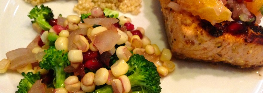 As my sides, I made quinoa and sautéed broccoli and corn. It was my second time making quinoa but it was fairly easy. I added some lime juice, orange juice, and chopped cilantro to the water when boiling the quinoa to get a flavor similar to the fruit salsa used with the fish. For the broccoli, I simply browned some onions in a pan, and then added about a cup of broccoli and the corn kernels from one ear. I also threw in a spoonful of pomegranate. I sautéed it for a few minutes, until it looked nice and bright.