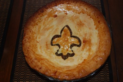 The next dish is tourtière. Each region has a different interpretation for it. I just picked one online that looked easy enough and modified it a bit. As you will see, the ingredients are very similar to the pork spread. I had never made it before and, to be honest, I wasn’t sure I even tried it before. When I did taste it, I realized it was very similar to the meat pies my mom makes. I made mine with a very patriotic fleur-de-lys, simply because of the occasion but I loved how easy it was to had this little touch so I might do it every time I make a double-crusted pie from now on. I simply put my dough (already rolled) on the counter, cut a piece off with a cookie cutter, and then sliced off about 1/8 inch around the shape. I put the crust on the pie and then put the piece back in the middle. Voilà!
