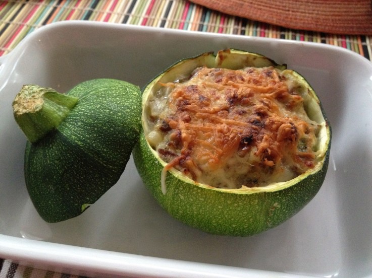 This is definitely my favorite time of the year at our local produce market. So many fruits and vegetables are in season, I feel like my head will explode every time I enter the place! Of course, I have a few favorites that I buy every week such as strawberries, blueberries, cucumbers, tomatoes, and corn. I also like to look at some produce that I’m not really used to. As they are local and in season, most are fairly cheap, which is perfect to experiment! This week, I found eight-ball zucchini. I knew about regular zucchini but I had never heard of the ones shaped like mini-pumpkins. Apparently (according to a very quick Google search), they mostly grow in Mexico and they really aren’t as commonly grown here (please correct me if I’m wrong). In any case, as much as I am not the biggest fan of zucchini, I couldn’t resist the cute shape so I grabbed two and decided to find a way to stuff them.