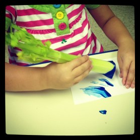 very colorful note. After reading about it online, I decided to try the blue celery experiment with the children. The idea is simple: you put a branch of celery (one that has leaves) in a jar or glass of colored water (food coloring), and wait for several hours, or days if possible. The celery, or at least the leaves, will turn blue. This is a great way to explain to the children how plants drink, and therefore, why we should always water the bottom of a plant in the garden, rather than the leaves (we have a garden at school so it was very convenient to compare the situations). I had prepared a branch the night before to make sure they would see the result without having to wait for several hours. The kids were in teams of two and each team had to pour water in a glass, add food coloring, and then add the celery branch. I gave them the tiny branches in the middle of the celery in hope that it would absorb the water faster, which it did! After showing them my overnight blue celery, I offered them to taste it and see if it tasted differently from regular green celery. Obviously, the taste was the same but they were all very excited to taste a piece of blue celery! Then, we used extra celery branches to paint on a piece of paper. Because it’s always fun to paint with something other than a paintbrush! Some children used the leaves to paint, others preferred making U’s with the harder end. It really wasn’t about the painted result but more about experimenting with a new painting medium.