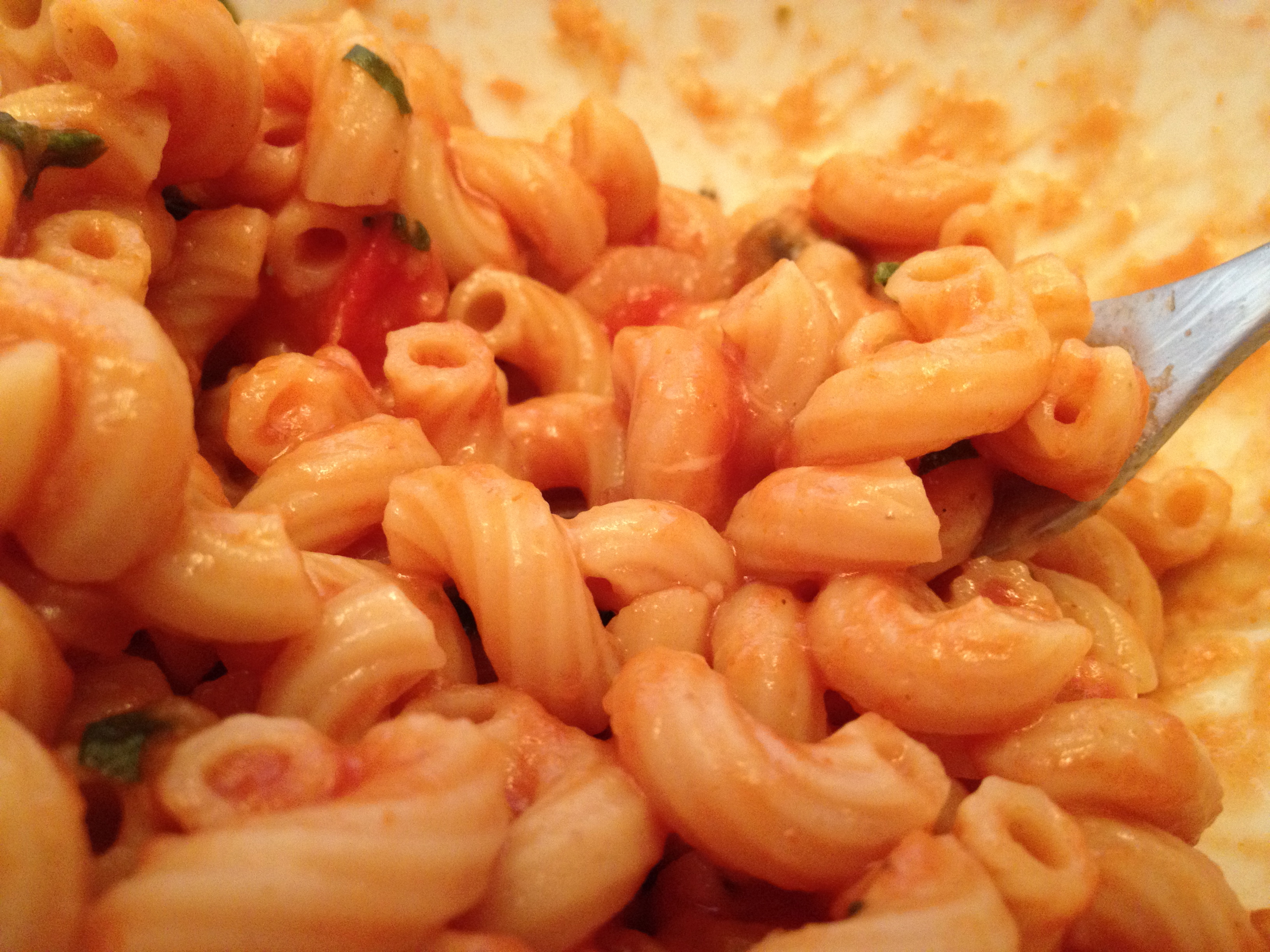 Over the weekend, I ended up having (still!) more homework to do for class. When it was dinnertime, I just wanted something quick so I could get back to work as soon as possible. I had in mind the tortellinis that had been sitting in the fridge for a long while. Key-words: they had been sitting in the fridge for a long while. I was so bummed out when I pulled them out only to realized that they had turned blue! Off to the trash it went and I was back looking for plan B. I found a little bit of whole grain macaroni in the cupboard. All summer, I either ate tortellinis or fresh pasta bought in town so I didn’t even remember that we had some macaroni noodles left. To go with the pasta, I was gonna go very simple: tomato sauce and whatever veggies I found in the fridge, which ended up being mushrooms, tomatoes, onion and green bell peppers. I added some of sea salt, black pepper, fresh oregano from my plant and some dried basil (my basil plant was too far for my lazy bottom). I threw this on the stove-top while the pasta were cooking and we were in business. At the end, I added a little bit of shredded mozzarella cheese just because I could. This super simple pasta dish ended up being one of my favorite in a while!