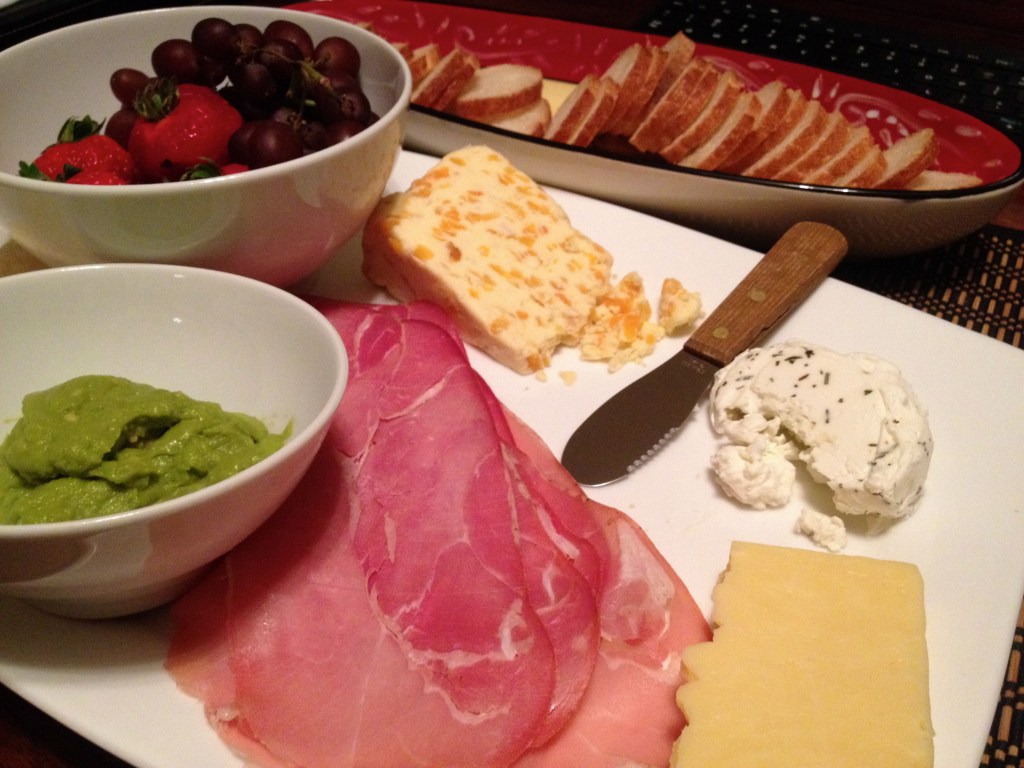 Living in Charlottesville, such a foodie town, it is really difficult not to go to the latest meatball place that just opened or to our favorite neighborhood restaurant. I’m not going to lie and say we won’t be eating anywhere but home because that clearly isn’t going to happen. On the other hand, I do believe we’re on the right track to, at the very least, not eat out quite as often. Case in point, I made us a cheese plate last night…well, more like a cheese/anything-else-I-wanted plate. We had some aged cheddar cheese, Purple Haze goat cheese, Wensleydale cheese with apricots, prosciutto, grapes, strawberries, fresh baguette, guacamole and rice crackers. You might wonder why I added guacamole in there. The answer is simple: I just wanted to. 🙂 And as a bonus, we have lots of leftover cheese, baguette and prosciutto that I’ll get to use in the upcoming days.