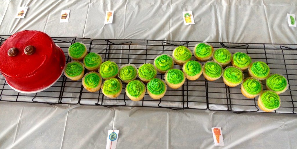As I already mentioned, Vari and I wanted to make a caterpillar cake for her son’s birthday. She found a great link on Pinterest and we figured we’d do our very best to get to a similar result. She order the caterpillar head (a round cake with red icing) from a local bakery so we only had to make the cupcakes and buttercream frosting. She found a very easy white cupcake recipe on Martha Stewart’s page and we were set. We had absolutely no trouble making the cupcakes. The frosting was a totally different story. We followed another recipe, courtesy of Martha, but the result was so gross. I’m not going to lie, it looked like cottage cheese. Grant it, we didn’t have a Kitchen-Aid stand mixer (but boy, do I wish I had one!!), and we didn’t really follow the instructions to the T. But I’d like to put some blame on Martha for putting together such a ridiculously difficult recipe for such a simple frosting. After realizing that we had completely ruined the icing, I text-messaged my mother-in-law, as I knew she had a very yummy recipe. And thankfully, she saved the day! A few minutes later, we had her recipe and we made one of the best buttercream ever. Vari’s husband actually said that it tasted just like store-bought frosting but without the gross chemical stuff. We did two shades of green by dividing the icing and iced our little cupcakes. I wish I took more pictures during the process but at least I took a picture of the final result during the birthday party.