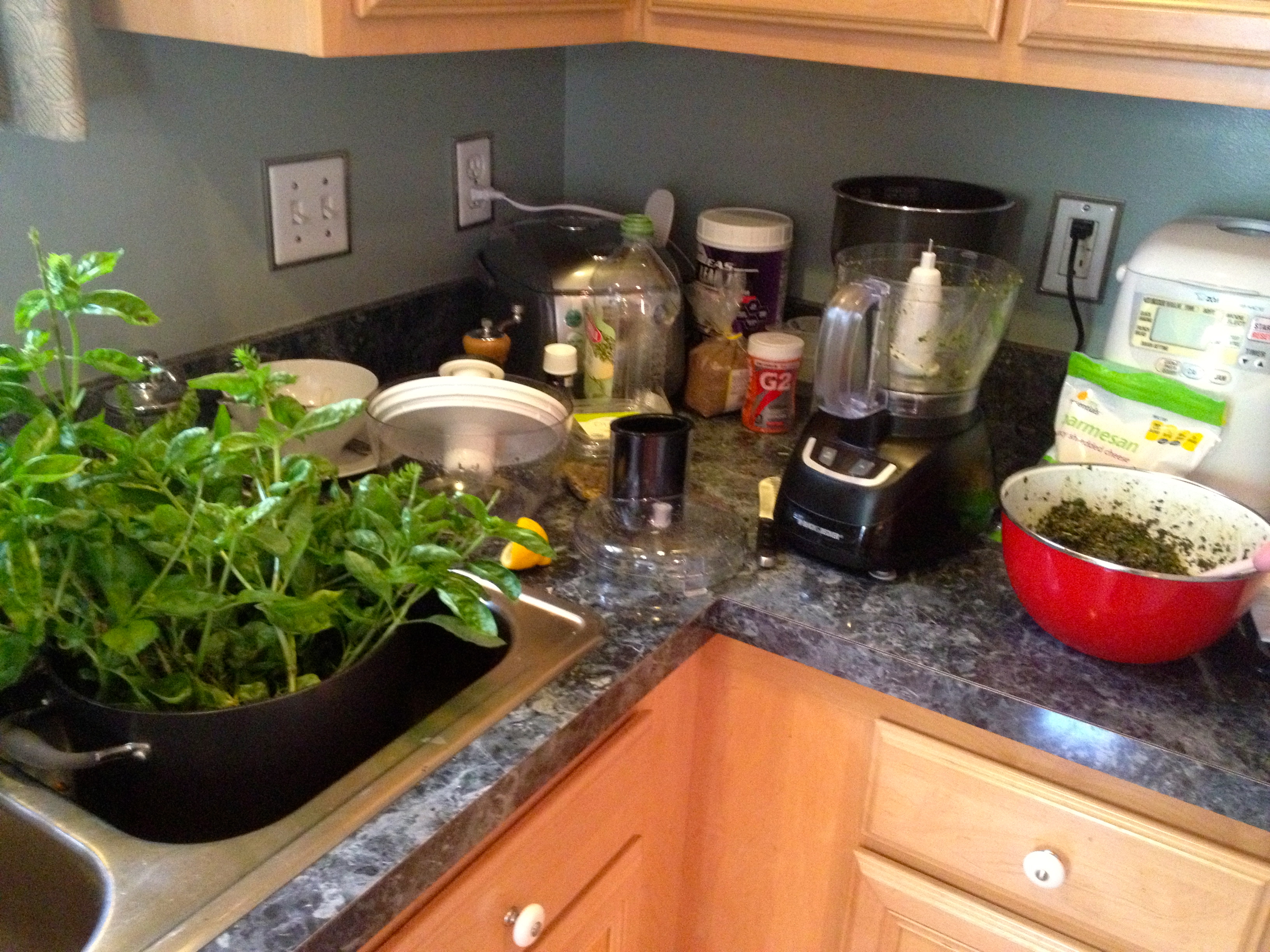 Exhibit C: My pesto corner. What you can’t see is my laptop on the other side of the sink, playing Scrubs, Dawson’s Creek, and all other sorts of funny or cheesy Netflix goodness all day to keep me entertained during this painfully long process.