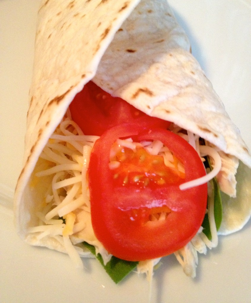 Wraps are such an easy meal, it’s a shame that I too often forget to make them. Last week, we made turkey tacos and we had a bunch of yummy flour tortillas left over. Although one day I’ll learn to make tortillas, the ones I used this time were store-bought. I grabbed whatever I could find in the fridge so most of my wraps look something like this: guacamole (I love this snack-size guacamole, just enough for one serving!) spread at the bottom, spinach, tomatoes, Mozzarella cheese, and chicken (from my leftover rotisserie chicken). It was so simple but super fresh, light, yet just filling enough at the same time.