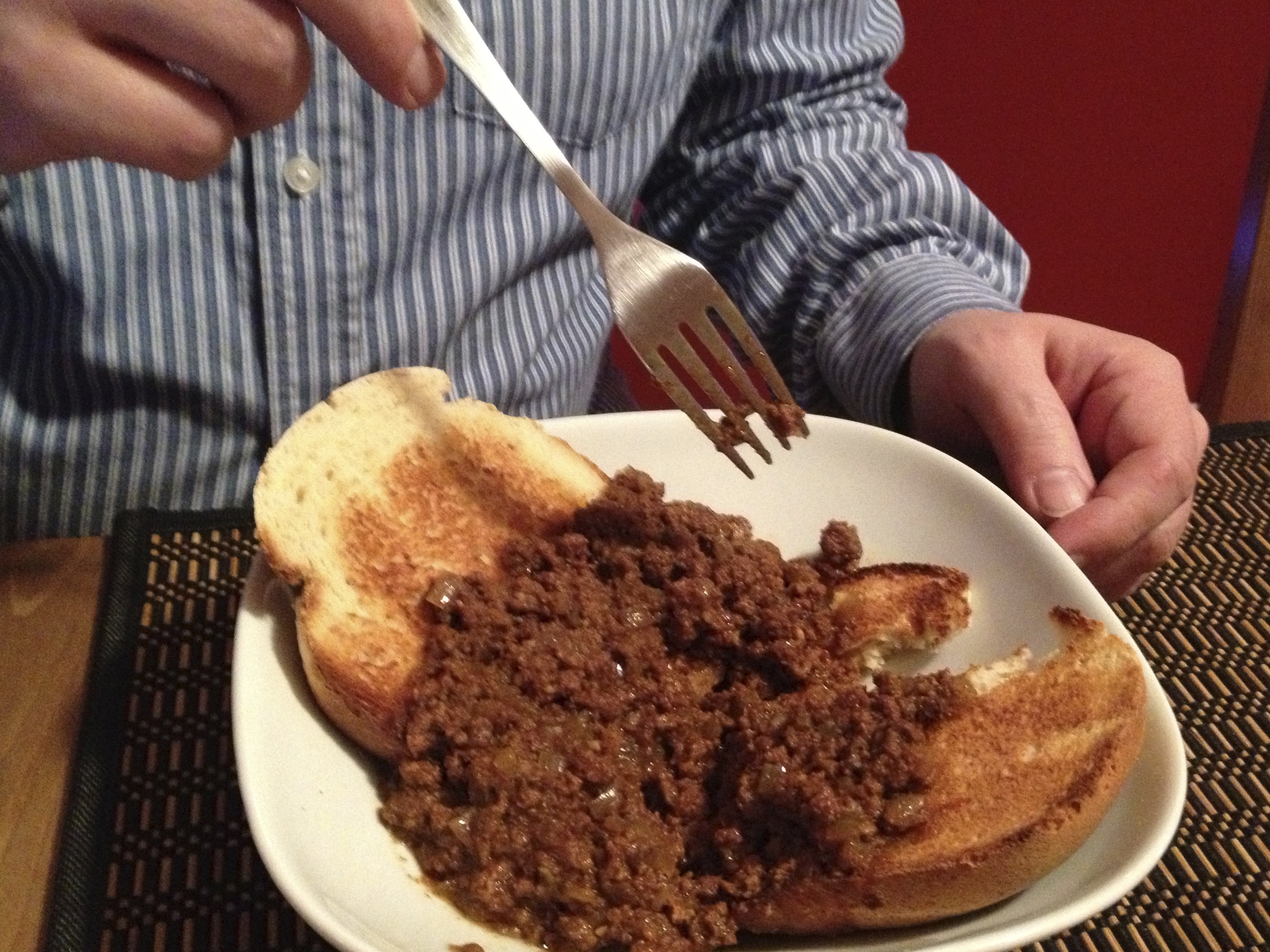 My husband’s version: bowl of chili with toasts of freshly baked bread.