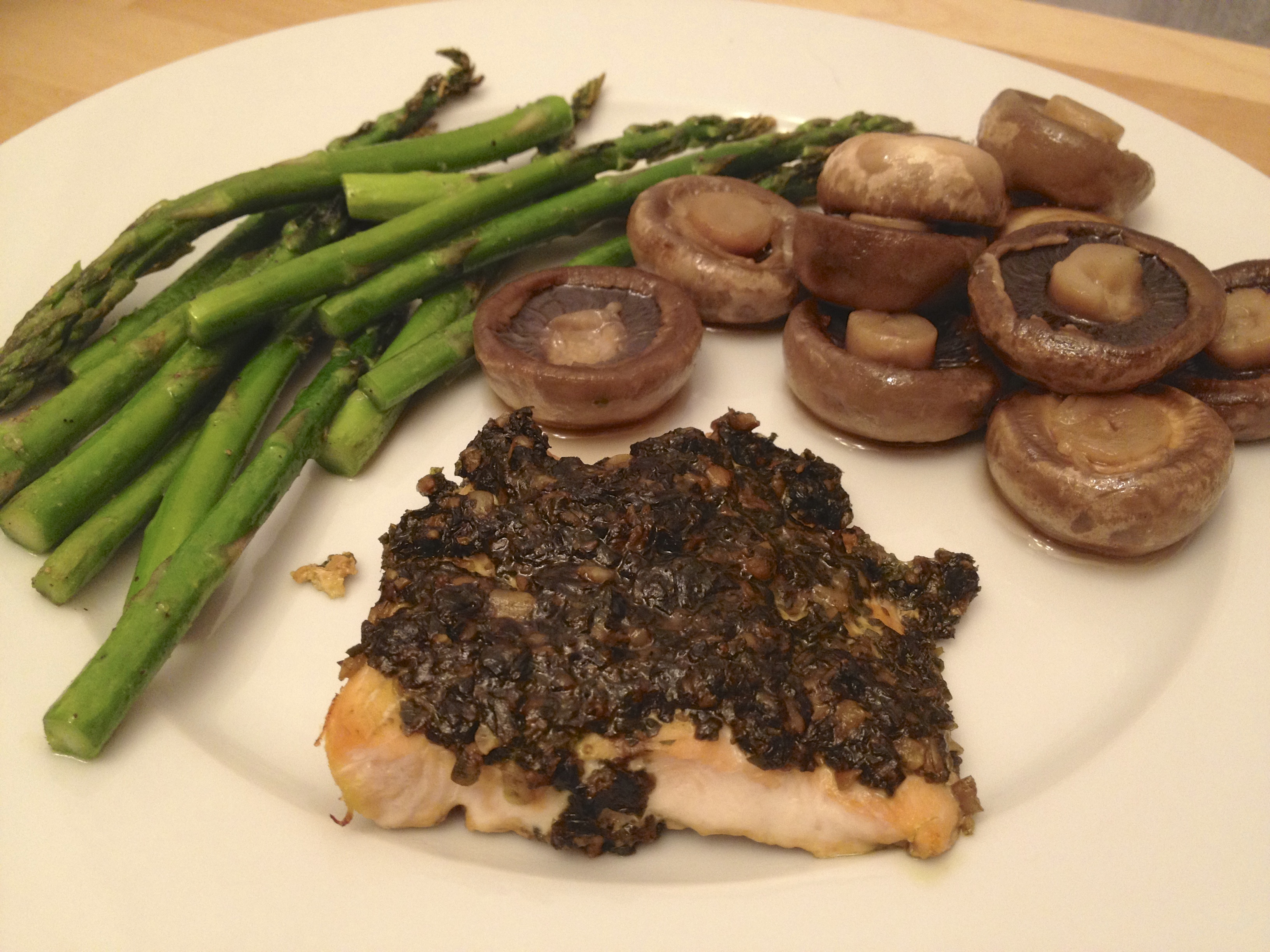 Pesto Salmon with Sautéed Asparagus and Mushroom