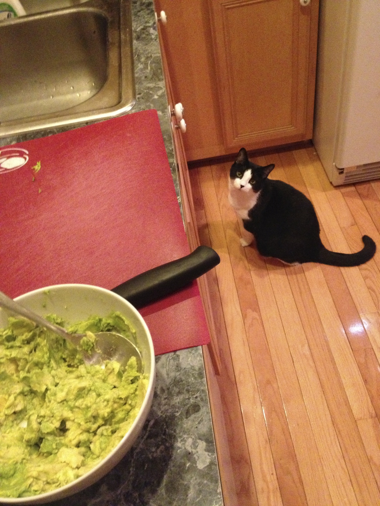 Spaz was especially impressed by the guacamole we made for our cheat night (we considered it cheating because of the chips). Somehow, the avocado being squooshed must have sounded like wet kitty food being placed it her bowl. Needless to say, she wouldn’t leave me alone.