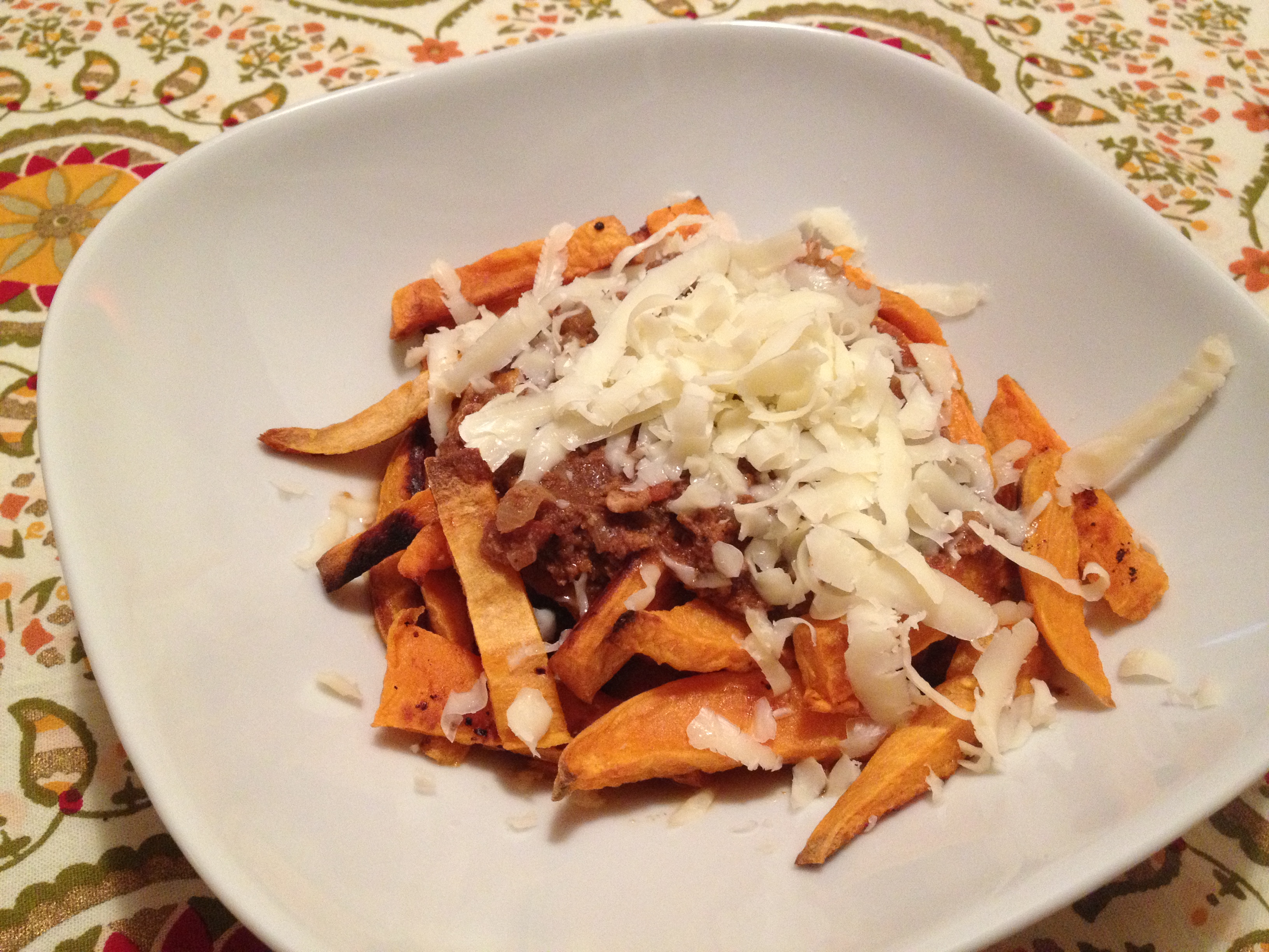 A problem emerged when I realized that my favorite side dishes to enjoy with chili (spaghetti, bread, hot-dog) wouldn’t be, in any way, Paleo. So I had to improvise with what I had around the house. That’s when Reddit came to the rescue, once more. I remembered reading about someone doing chili fries with sweet potato fries. Why not? I made the fries in the oven (400˚F for 30-40 minutes) after tossing them in a little bit of olive oil and sea salt. Of course, my poutine-brain assumed that fries and “sauce” also needed to involve cheese! I shredded a little bit of sharp cheddar and dinner was ready!