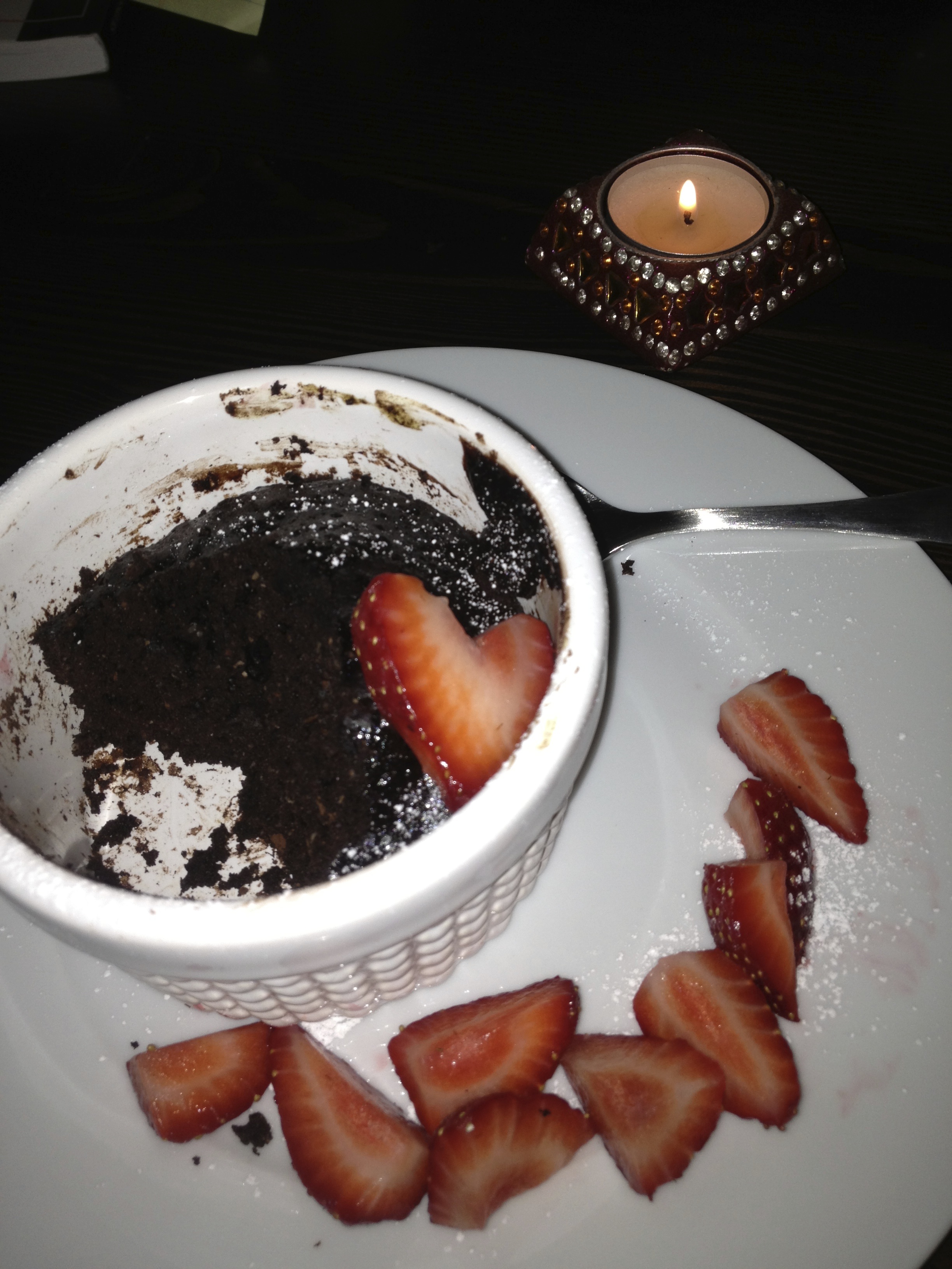 I already knew about mug cakes but didn’t know there was such a thing as a Paleo version! I found Delighted Momma’s version and couldn’t wait to try it! The result was slightly dry (probably due to my lack of proper measurement) but nothing that a little Bloop vanilla frozen yogurt couldn’t fix! I made them in small ramekins instead of mugs…just because I wanted to make the evening “fancier”. Alright, I wasn’t trying to be fancy. In reality, I bought the ramekins at Target a few weeks ago and planned to make a Valentine dessert in them. I didn’t care what it would be, it simply had to fit in the dish. Now you know how I plan meals. 😉