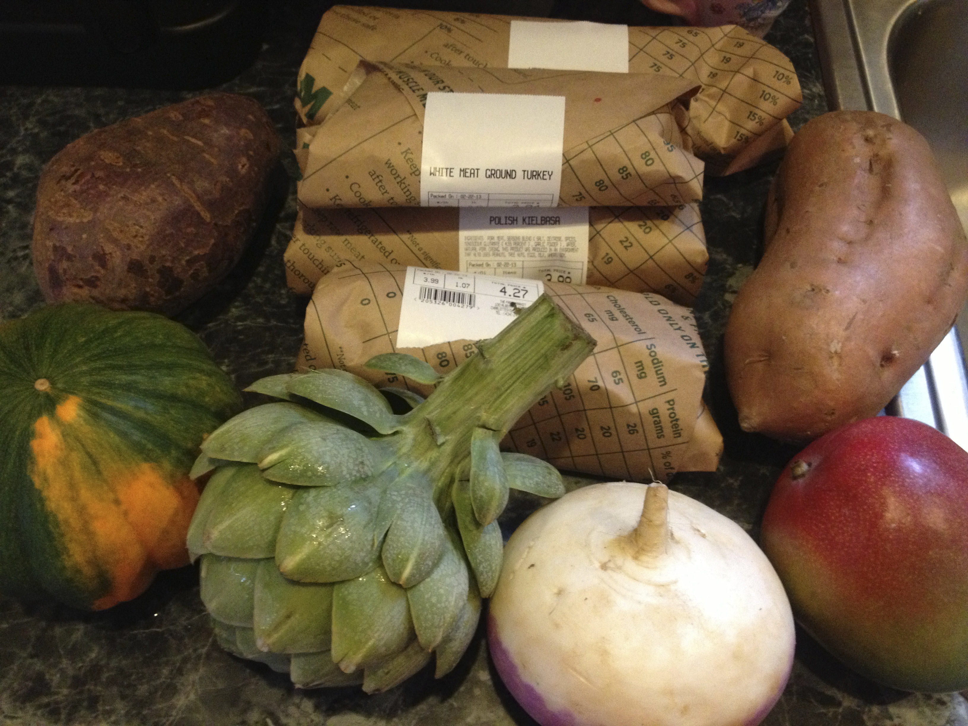 Over the weekend, I had an exciting second trip to the Fresh Market. Yes, it will probably take me a while before I get over how amazing that place is. I planned to only stop by their meat section (came back with chicken breast, stew beef, kielbasa, and ground turkey) but couldn’t help grabbing a few vegetables as well (artichoke, acorn squash, turnip, sweet potatoes).