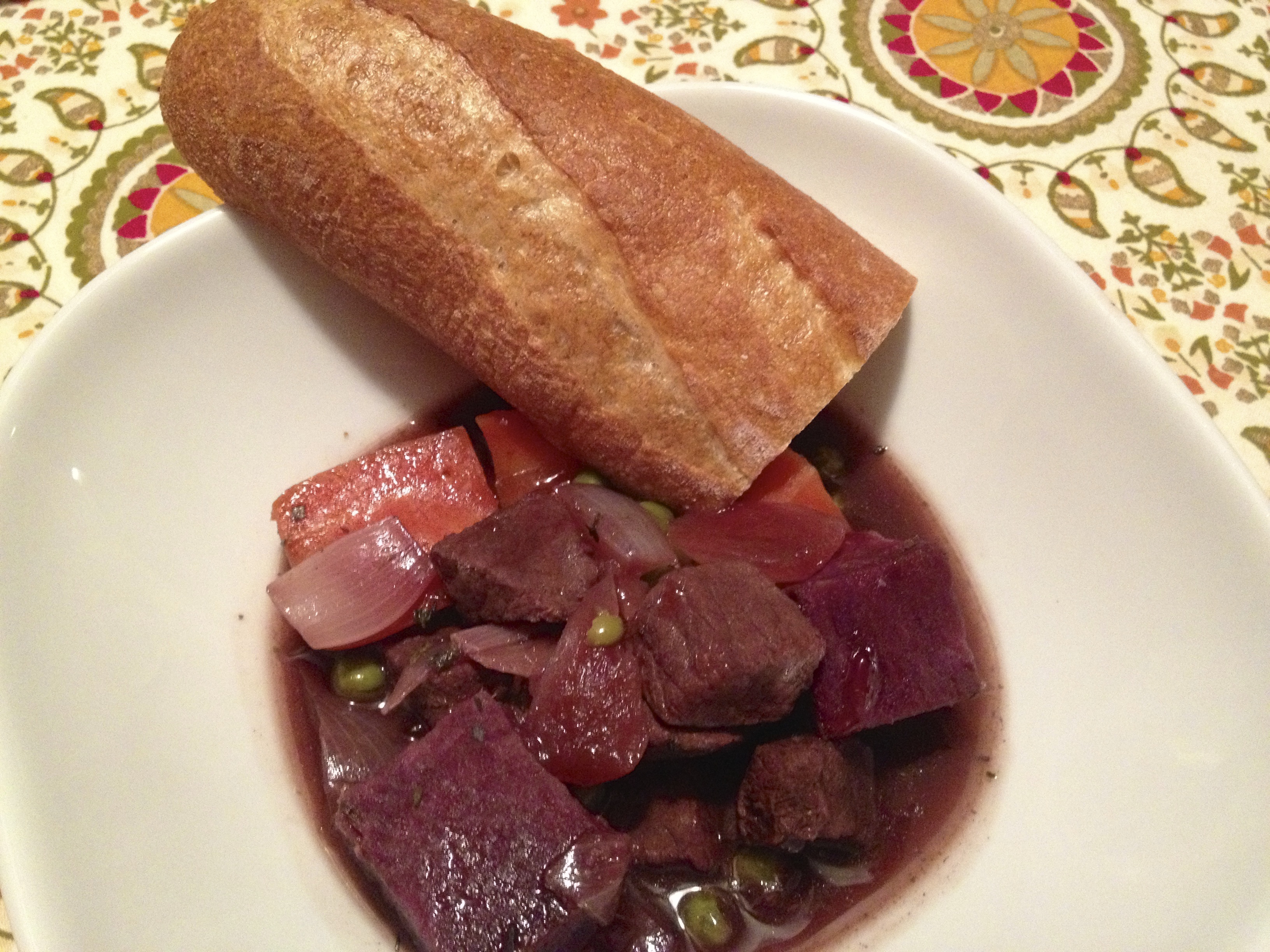 Today, I made a beef and root vegetable stew. Good stuff. Stews make me very happy and I still don’t know why I don’t make them more often. It was my first time cooking turnip and PURPLE sweet potato! The princess in me was super excited about a girly-colored vegetable! 🙂