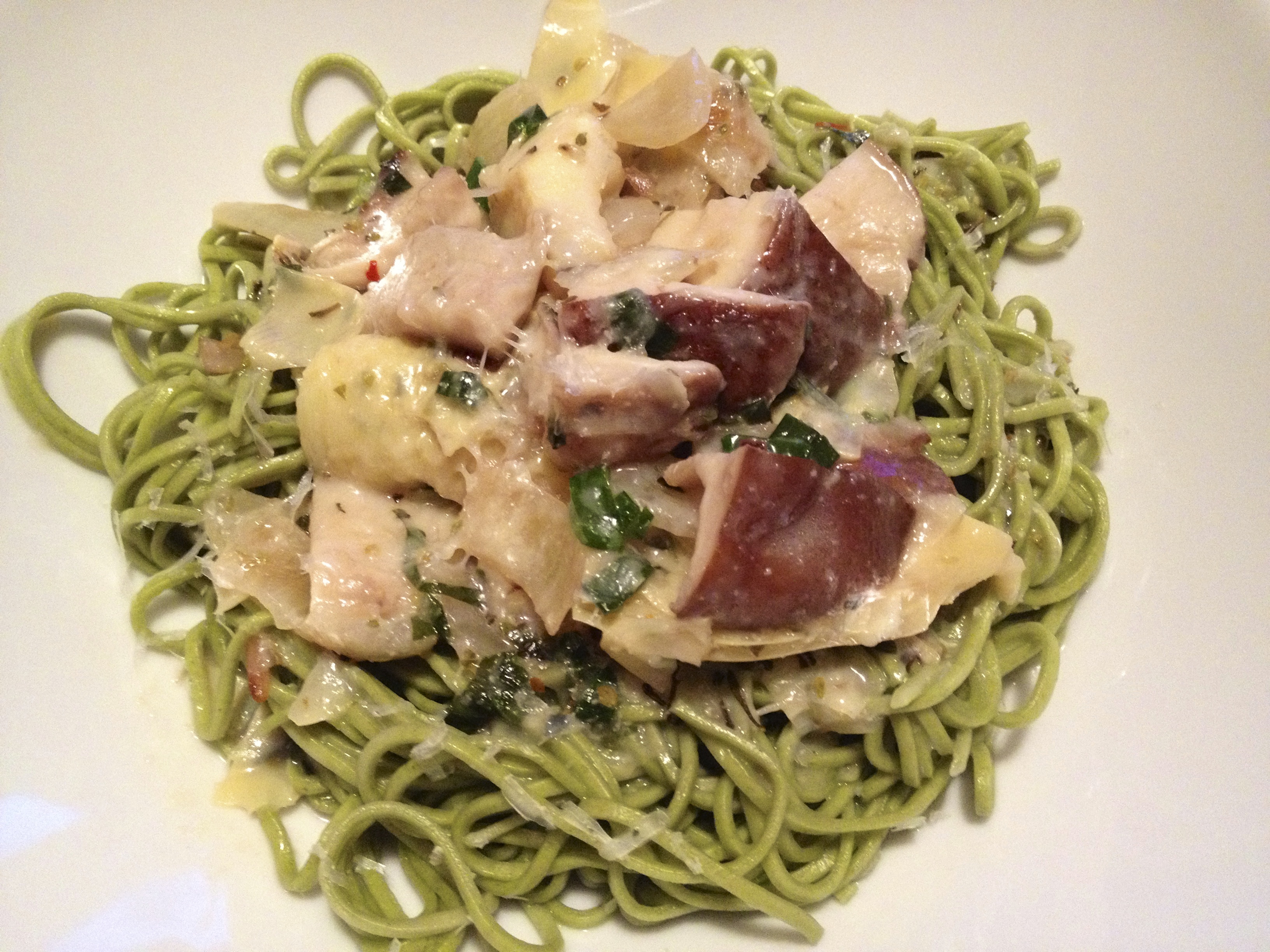 On my first night alone, I decided to be adventurous and try to make a dish that Jeff wouldn’t normally want to eat. The idea was to make a mushroom and artichoke ragout with coconut milk, served over locally-made spinach pasta. It seemed like a great idea but, unfortunately, the resulting flavor was slightly off.