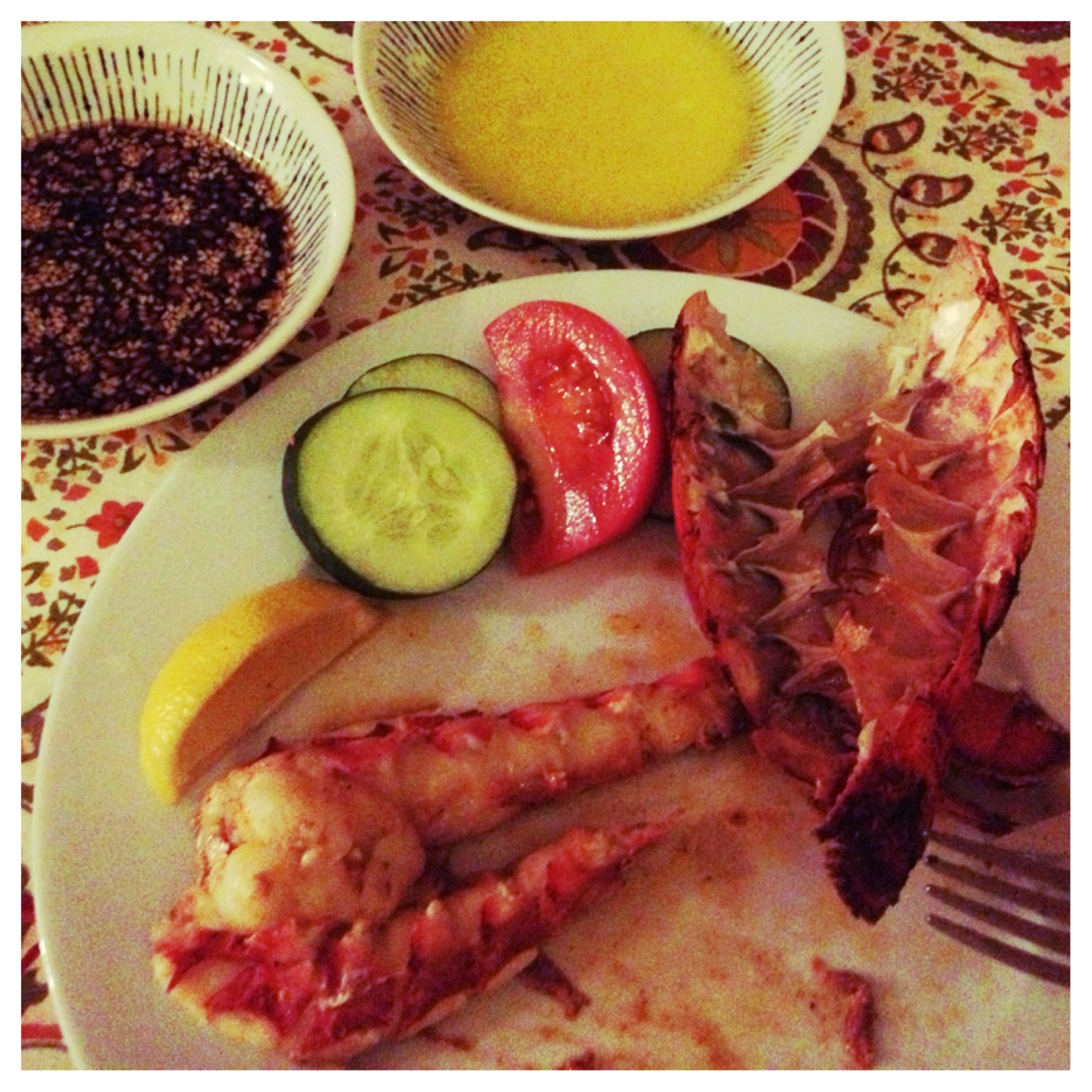 My parents always loved eating lobster but I never wanted to try it when I was growing up. Now that I have vastly improved my palate, I wanted to give it another chance. So The Fresh Market‘s buy one get one free offer on lobster tail was the perfect opportunity. After googling different ways to cook it, I chose the easiest: broil for 5-10 minutes. Before cooking it, I seasoned it with paprika, salt, pepper, and melted butter. For the dipping sauce, I was looking for an alternative to garlic butter (although I made it as well) so I used this Asian dipping sauce recipe. It really went well with the lobster and I didn’t end up using the garlic butter. As we had a big lunch and weren’t looking for a heavy dinner, I didn’t make rice for the side, and instead cut some fresh tomatoes and cucumber to serve with the lobster.