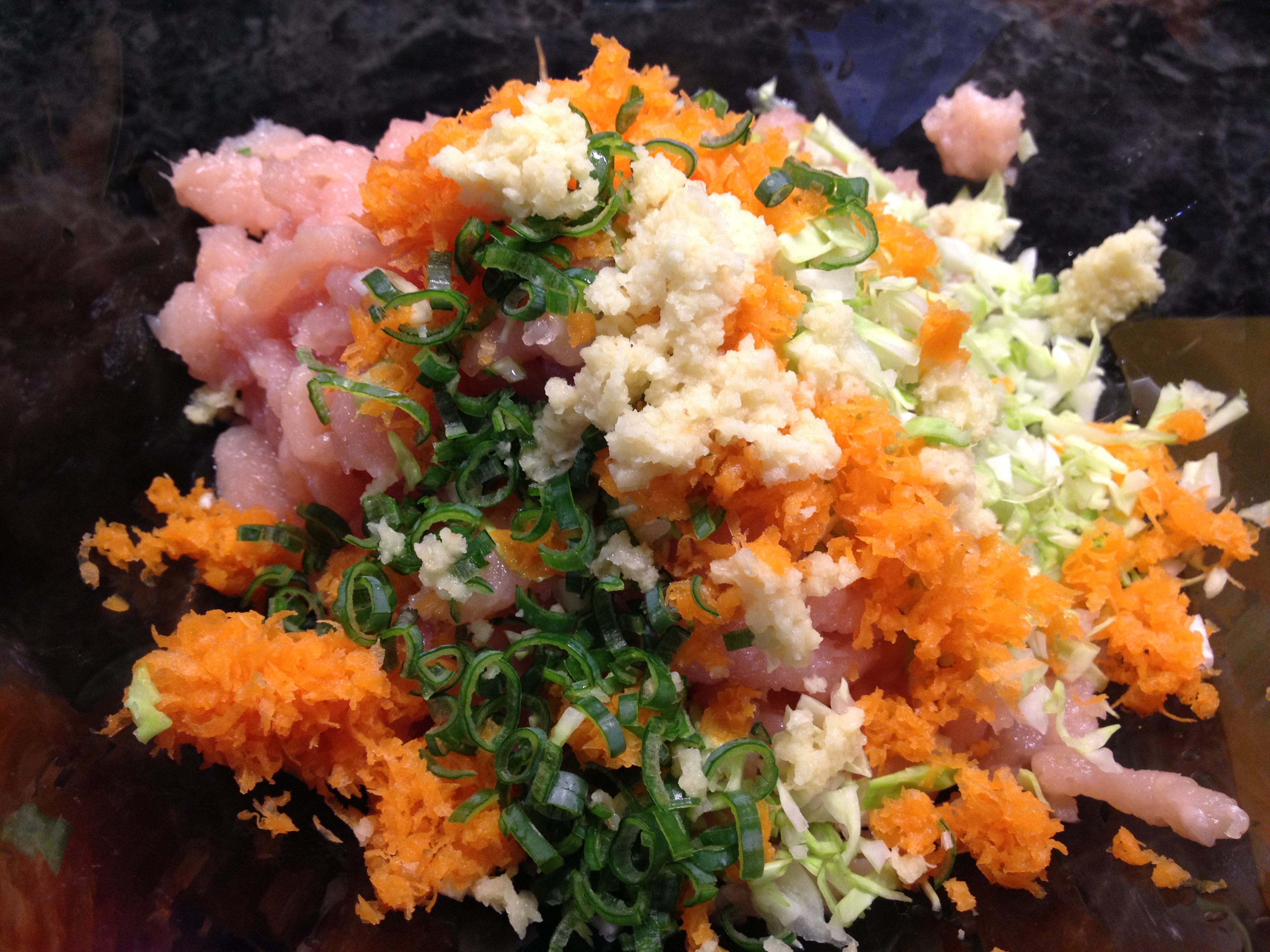 As I said, we were trying to avoid buying any food until we used everything we had. And to a certain extent, I followed the rules. But I did have to buy a cabbage and a ginger root. Everything else came from somewhere in or around the house. The spring onion came from our garden, I ground the chicken breast we had in the freezer (and yes, I still find grinding my own meat very exciting), the wonton wrappers had been in the freezer for quite a while (it was about time I finally used them) and the rest was basic stuff that we always have around the house (soy sauce, carrots, sesame oil, salt & pepper).
