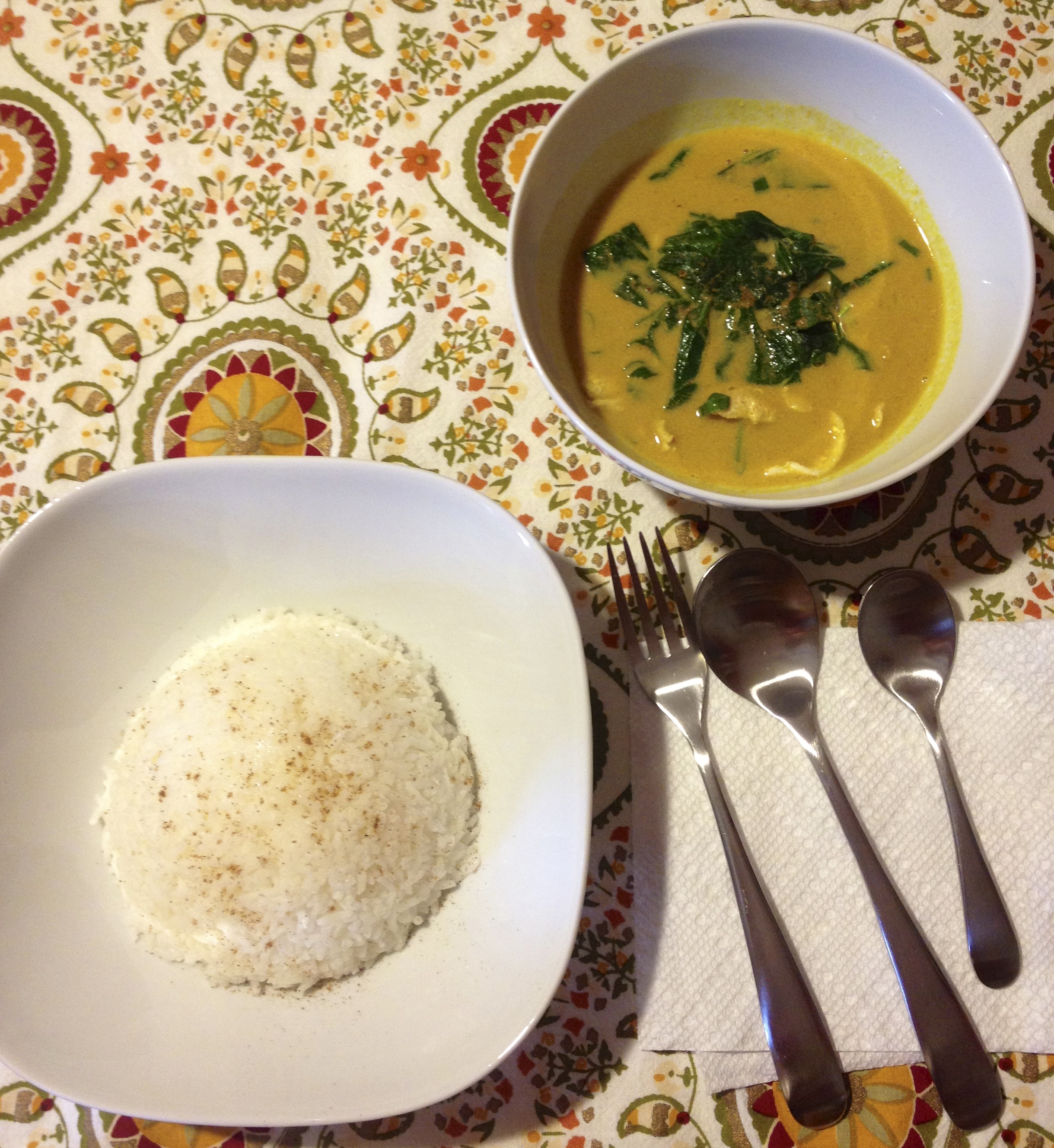 On Saturday night, I didn’t know what I wanted. I was tired and hungry, usually two key ingredients to suggesting to eat out. As I was willing to cave in on any option brought up by my husband, he started roaming around the kitchen (pantry, fridge, freezer, repeat!) until he suggested making dinner for us. As I was writing a few greeting cards, I couldn’t help but enjoy the various smells coming from the kitchen. Jeff made a chicken curry, which was, in my mind, just as good as anything we’ve ever had at a restaurant. He made steamed Jasmine rice, a rich curry sauce (with a base of almond milk) and thin sliced chicken breast. Upon Jeff’s request, I went to the garden and picked up and few leaves of basil and a big piece of green onion. He also added a bunch of spinach, a favorite in our house. The result was amazing. Even though it was too spicy for me, I still couldn’t stop eating. It was so good! We did agree that we’d find a way to make two different sauces next time, or find a way for Jeff to make his portion spicy, while leaving mine mild.