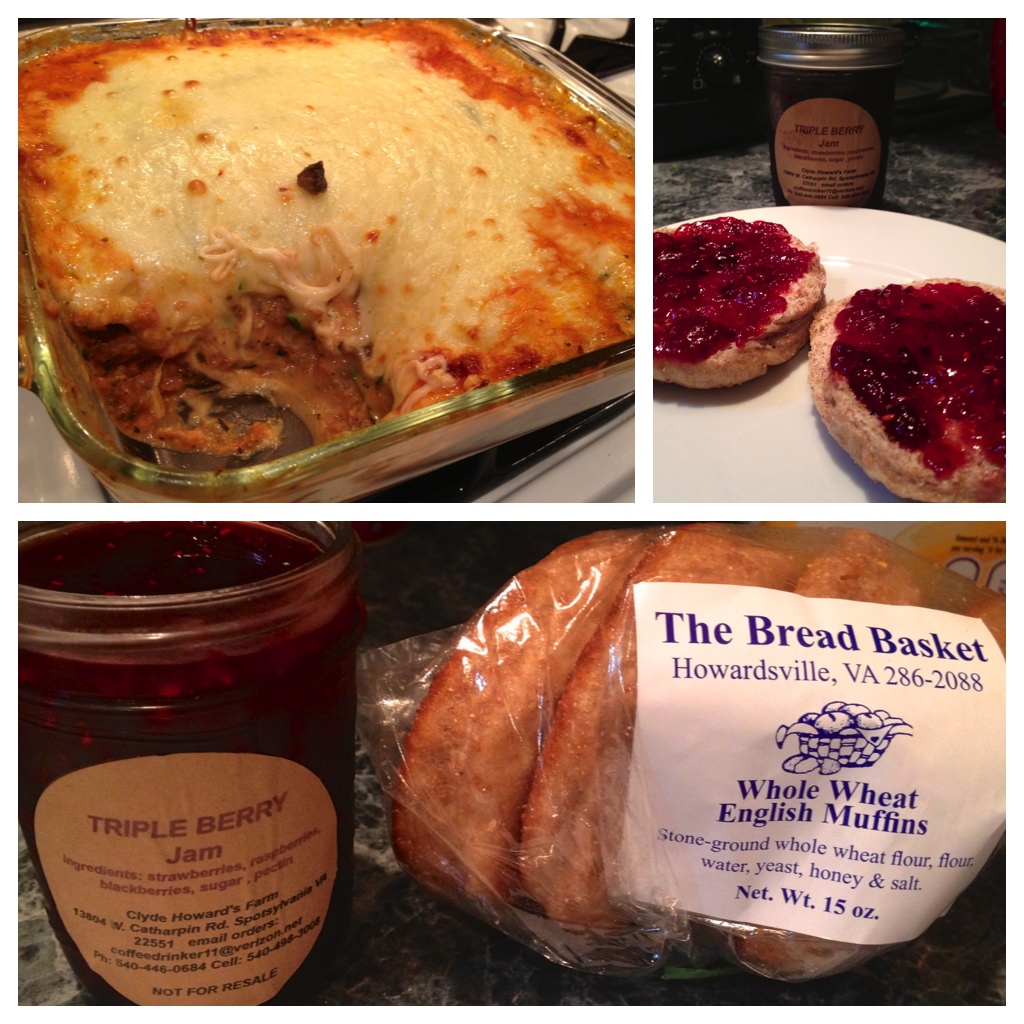 - I started my week off with a treat breakfast: Triple berry jam from my June Foodie match on locally made whole wheat English muffins from The Bread Basket. I love these English muffins but since they don’t have any additives (yay!), they don’t last very long (boo!). Since I try to cut down on breads/pasta, I only buy them so often, as a treat. And the jam was absolutely berrylicious! 🙂