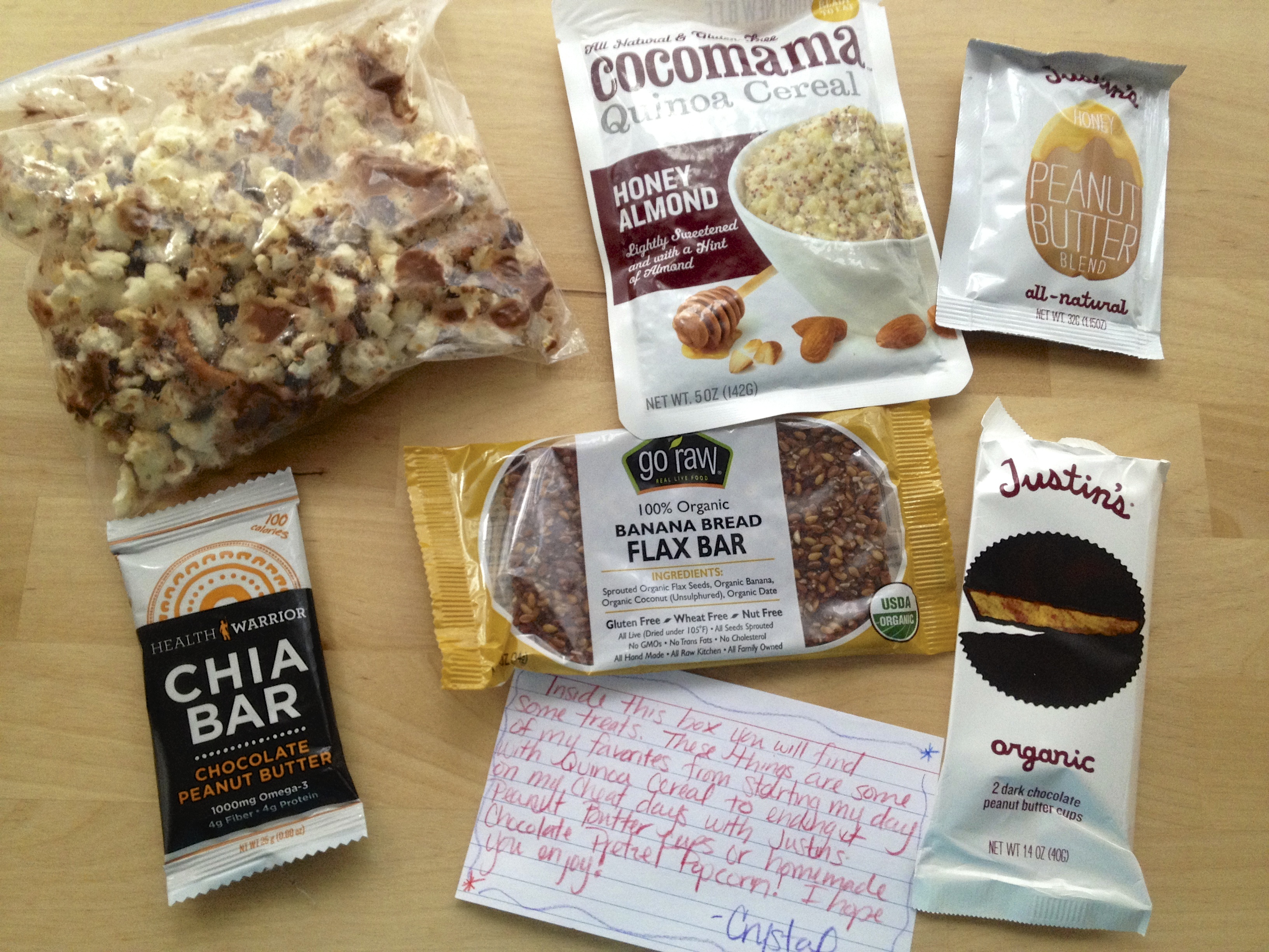 I received my package from Crystal who lives in Maryland. She is currently working towards a degree in nutrition and this definitely came through in her awesome package. Here’s a look…