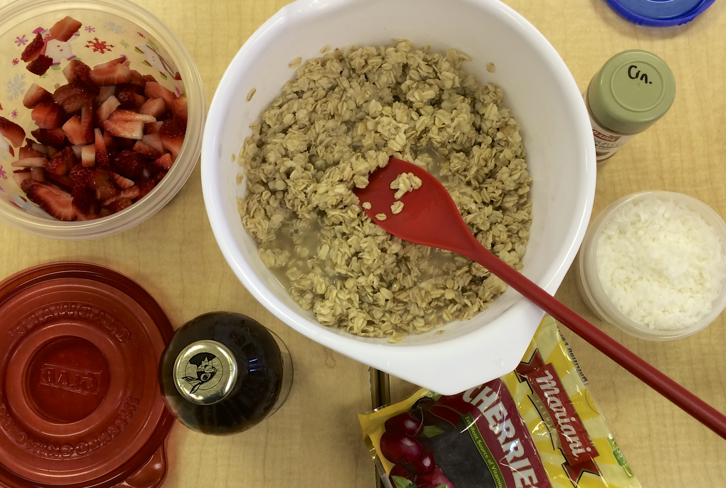 Last week, as we introduced the toddlers to many classic tales, our cooking project seemed very obvious (at least to me!): porridge with the three bears! I preferred making oatmeal, so as I read them the book, I simply substituted the word in the story. Although this dish didn’t involve any cooking on the children’s part, it did involve a lot of tasting! The wonderful mom in charge of bringing snack that day brought a variety of toppings, including dried cherries, coconut flakes, fresh strawberries and molasses. While the oatmeal was cooking with the boiling water (at a safe distance from the toddlers), we invited them to taste all the toppings to later choose what they would want in their bowl of oatmeal. The children enjoyed all the toppings but our biggest pride was to have them try molasses, since it’s a very particular taste. Most of them loved it. Once the oatmeal was ready, we asked them to tell us which toppings they wanted in their oatmeal. The majority of them ask for a mixture of all the toppings.