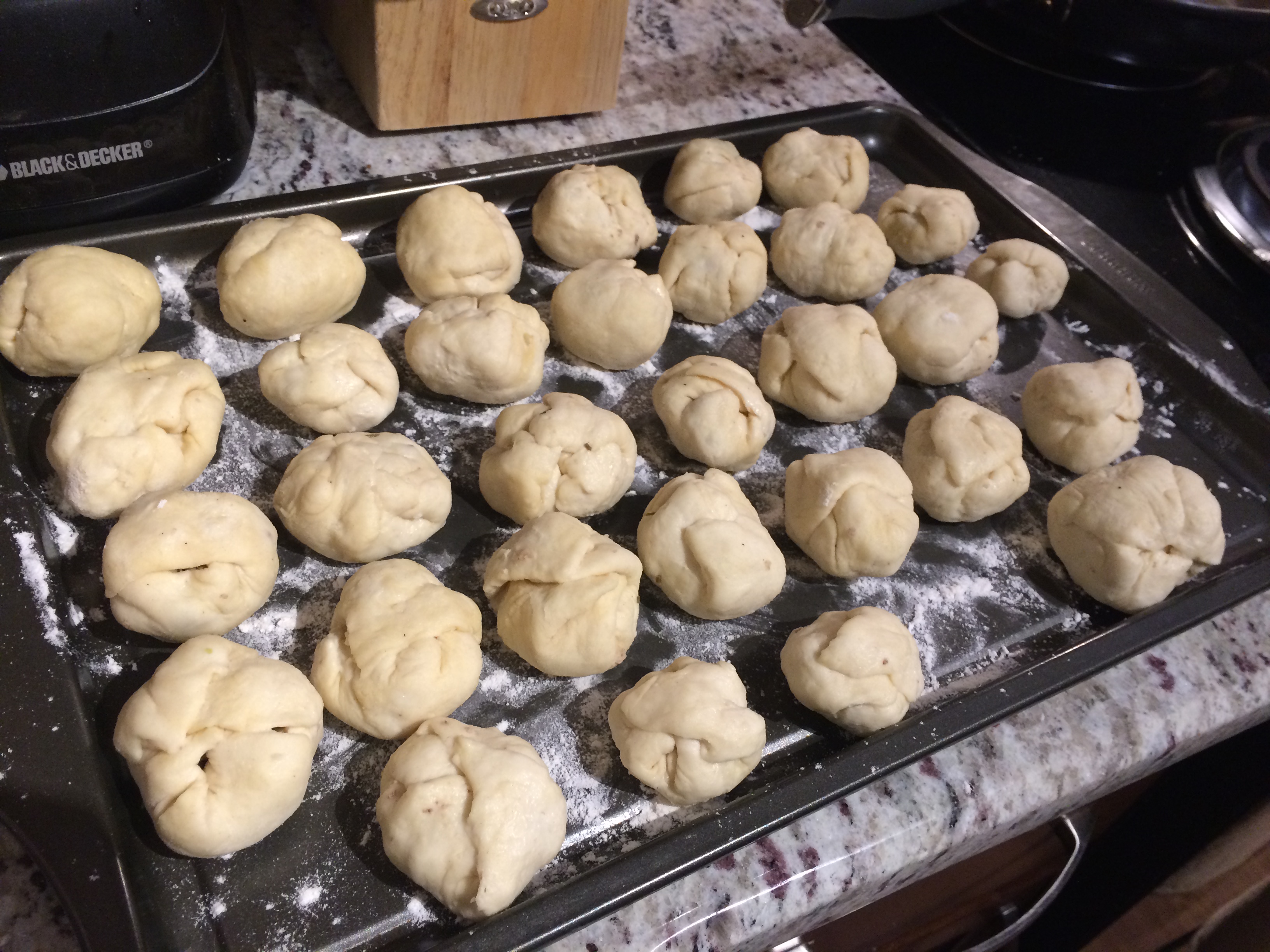 3. Put the dough square in the palm of your hand and place about 1 teaspoon of meat filling in the middle. Close the dumpling as tightly as possible. I used milk to help “glue” the dough together. Gently roll the dumpling in your hands to make it as round as possible.