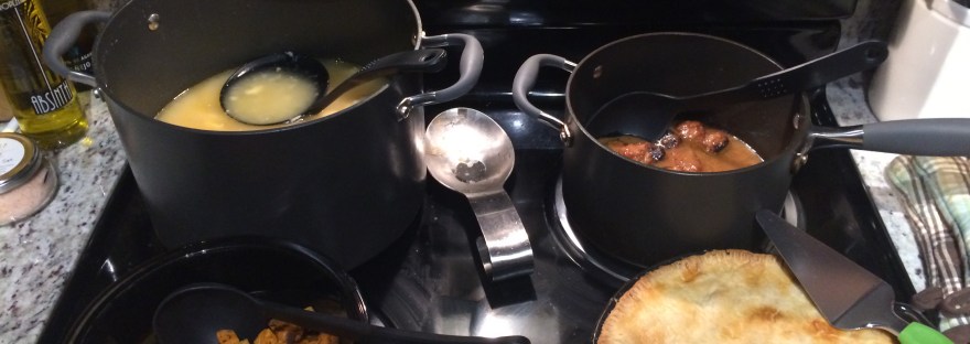 In my last post, I presented all the sweets I baked in December, most of which were mailed to relatives. Now here’s the savory food I made and enjoyed on Christmas. Since we didn’t travel to Virginia for the holidays, we invited friends over for Christmas dinner. I wanted to come up with something traditional to make but decided to stick to my Quebec traditions rather than the American way. My menu was meat-packed: meat pie, meatballs in gravy and meat-filled dumplings.