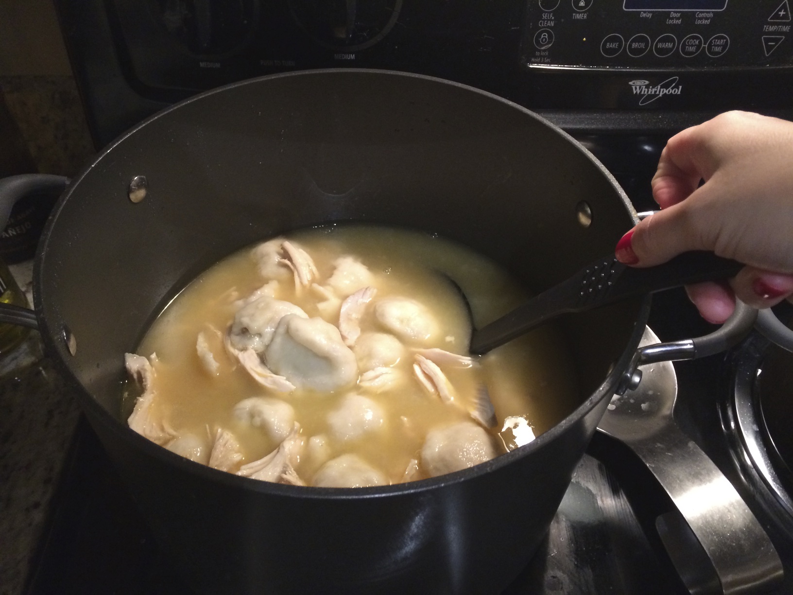 6. But the turkey and broth in a large pot and bring to a boil. When boiling, add the dumplings and cooked, covered, for 20 minutes, bringing the heat down to medium. Do not remove the lid during the 20-minute period or the dumplings might not cook properly.