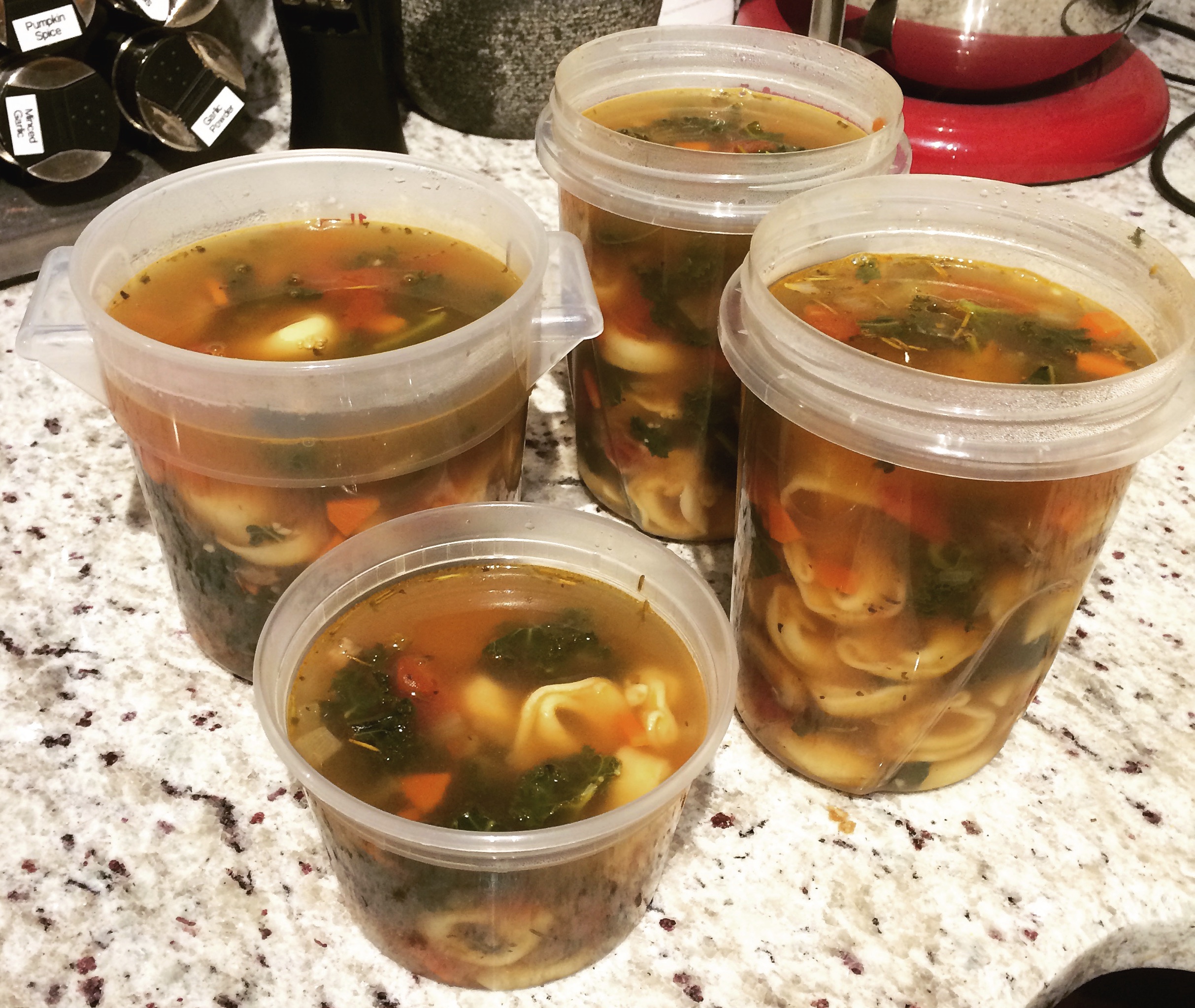I’m quickly reaching the point where our freezer is full of all the extra soups I have made in the past few months. Seriously. Our freezer is filled with chicken noodle soup, Quebec dumpling soup, split-pea soup, winter greens soup and now, I just added a container of tortellini soup. It’s getting out of hand. The problem is that each week, I think I will just eat the soup we have in the freezer. Then I find a new recipe and change my mind. I appear to have a soup addiction now.
