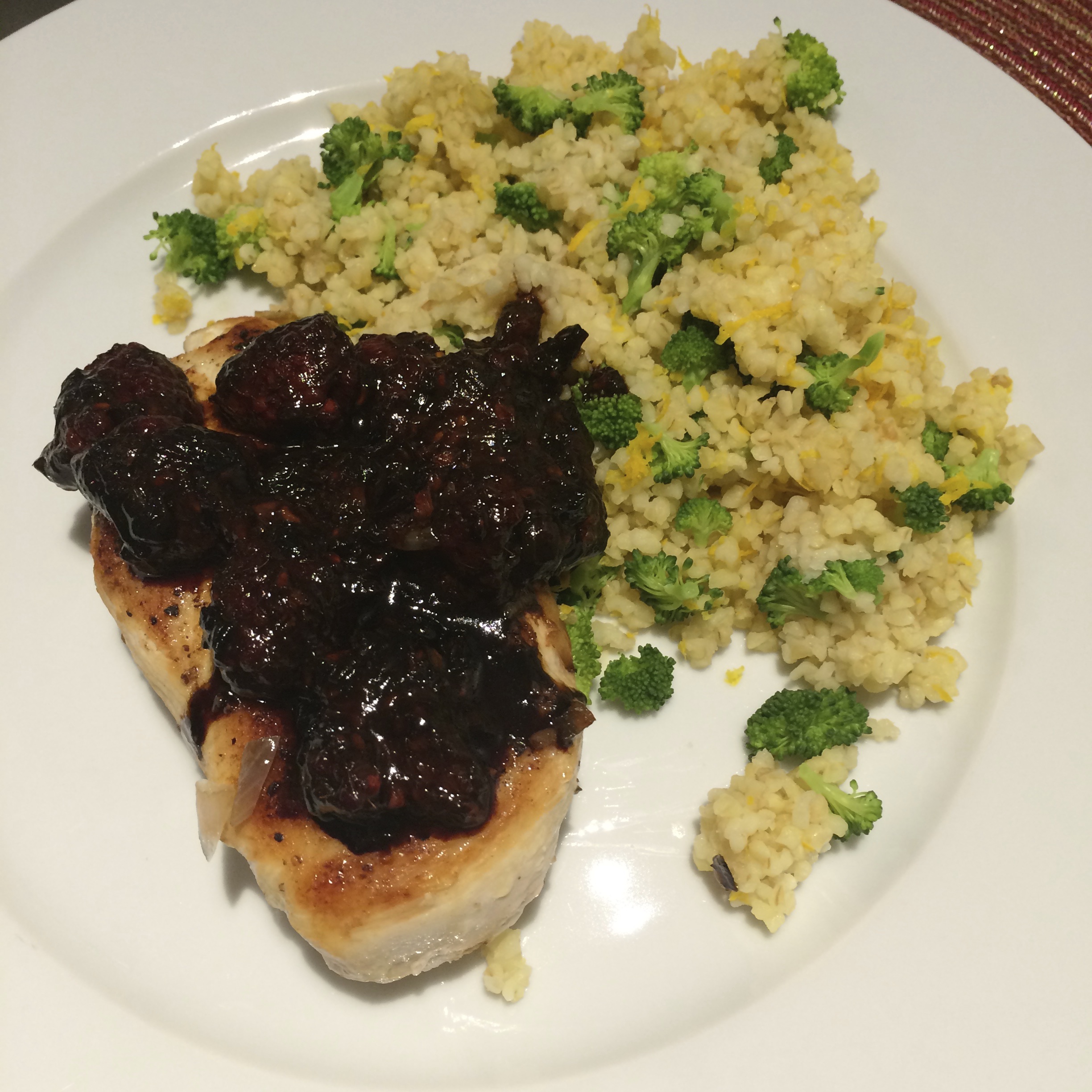 Spicy Raspberry- Balsamic Chicken with Orange-Broccoli Bulgur