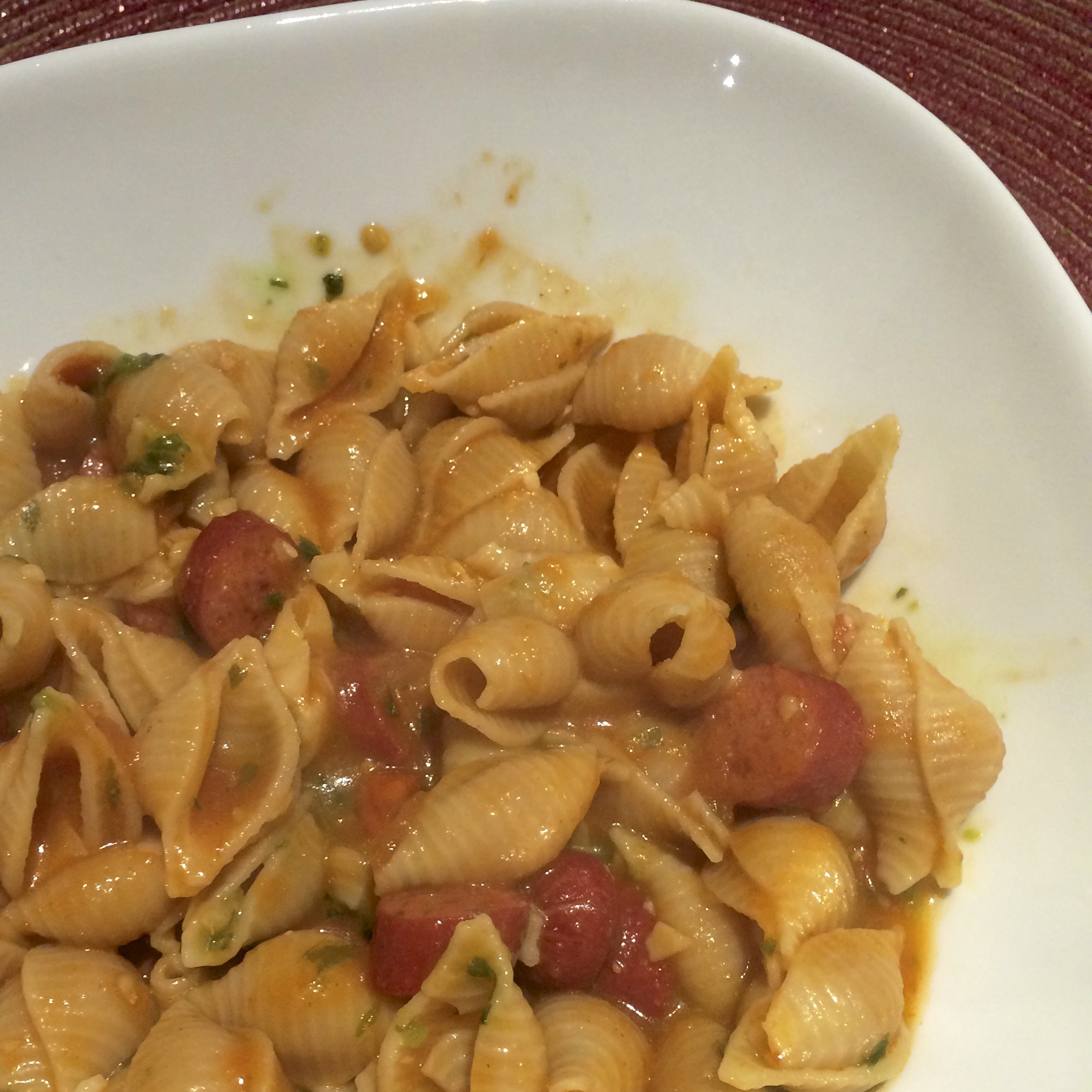 You know when you don’t really feel like cooking and you don’t really know what you want? Well that’s when I come up with my laziest dishes. Originally, my husband was going to make curry but when he changed his mind at the last minute, I had to come up with something. Although I felt lazy, I still wanted to be creative. So I grabbed random items from the pantry and the fridge: half-full container of whole-wheat shells, beef hot-dogs, the bottom of a marinara sauce jar, a ripe tomato, garlic and basil paste. The result was not bad. Better than I expected, in all honesty. But certainly not my proudest achievement.