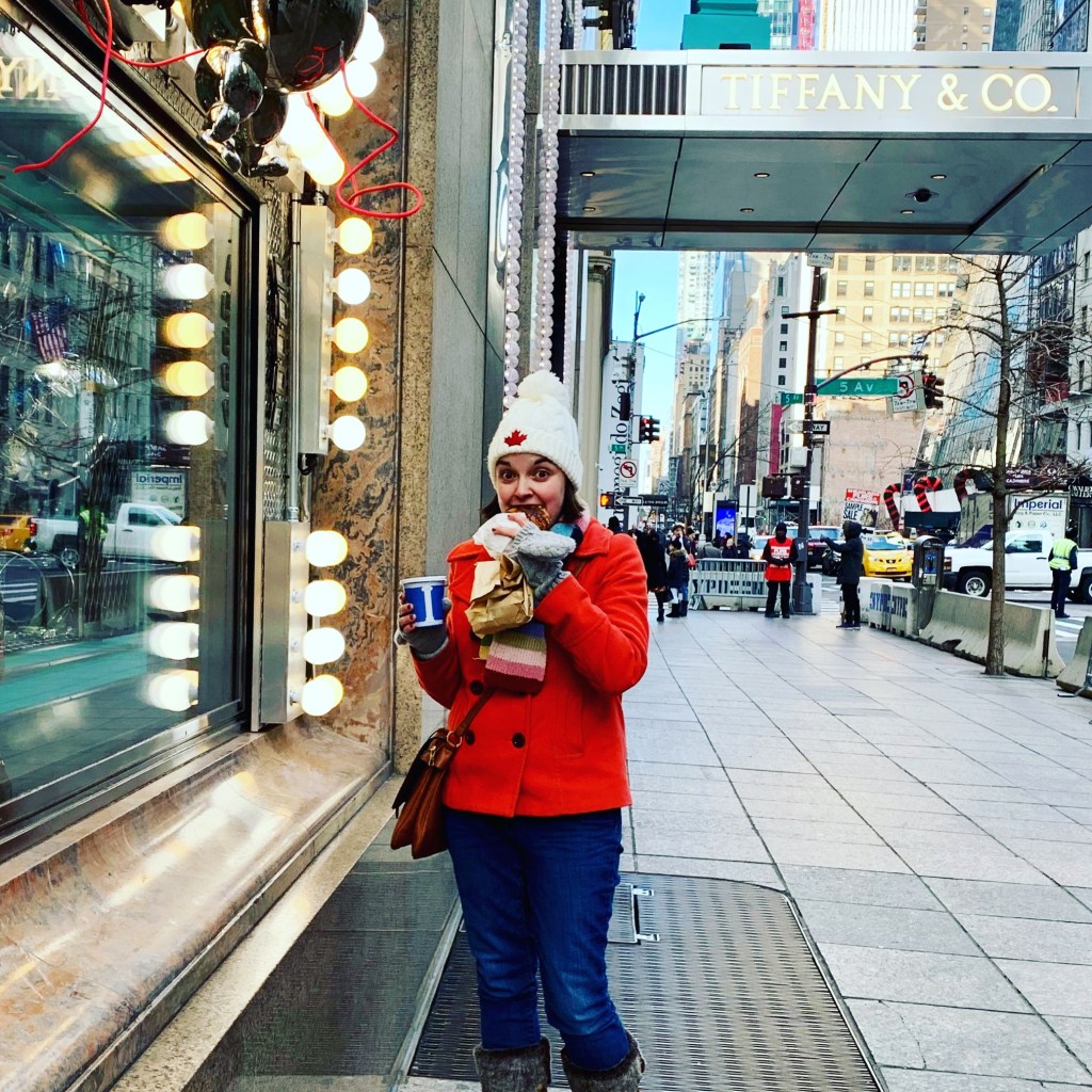 - I convinced Jeff to help me check something silly off my bucket list as I bought a pastry and a coffee from a street vendor and ate it in front of Tiffany’s…just like Audrey Hepburn did in Breakfast at Tiffany’s, expect looking less fabulous than she did. Haha!