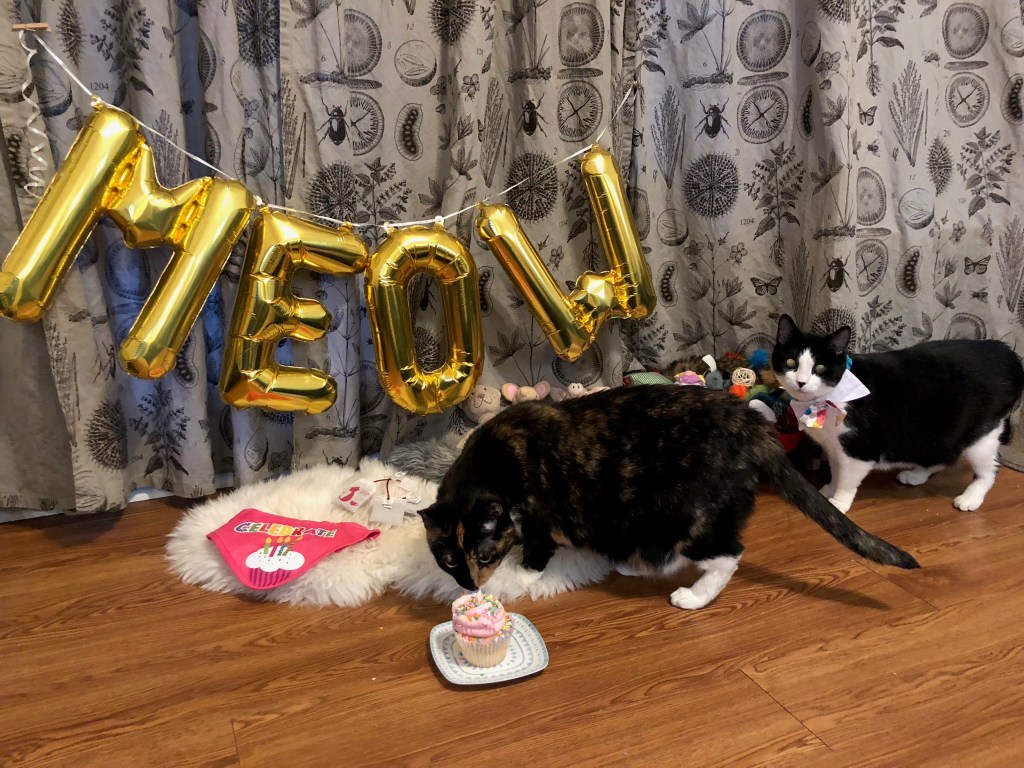 - The kitties celebrated 9 years with us, and turned 11. With a traveling husband, I turned into a crazy cat lady, and set up a full on birthday party with balloon, costumes, all their stuffed babies and…cupcakes.