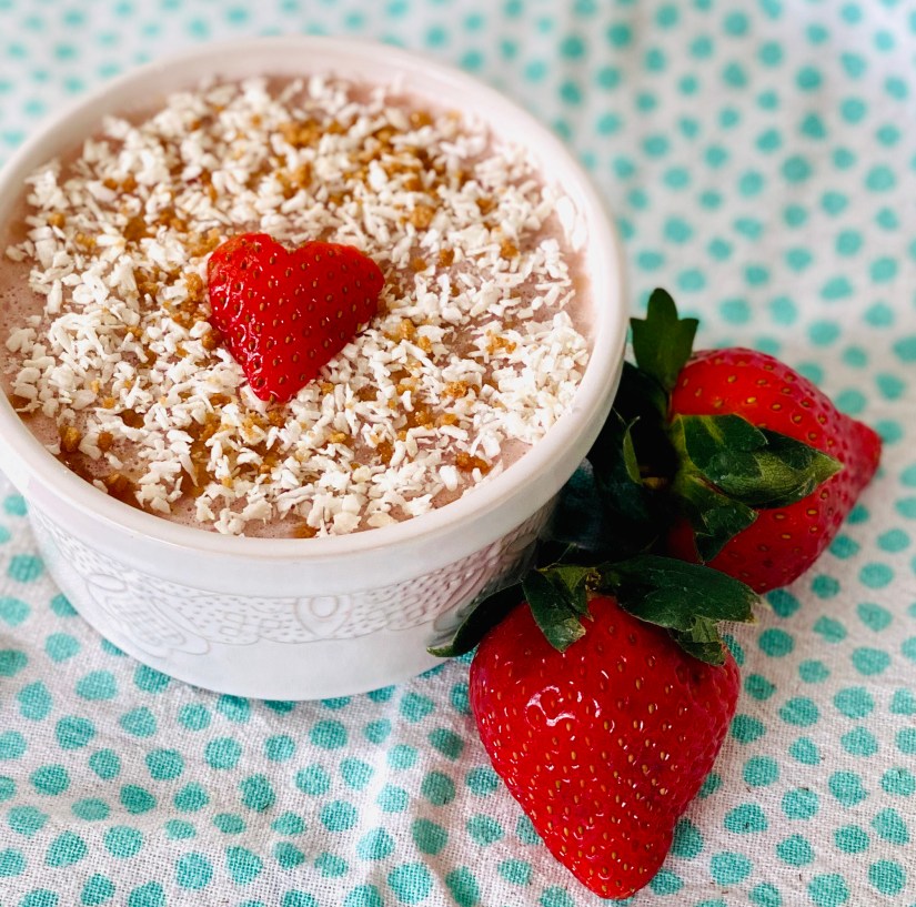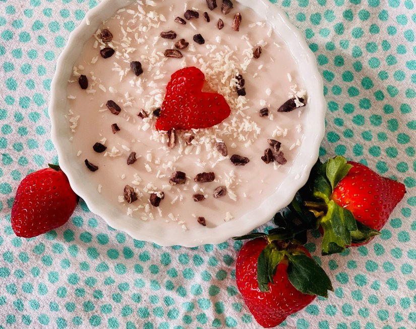 His was a lot simpler to make: Basically it is the same gelatin based but instead of the whipped cream and strawberries, I used something I know he can eat…Chobani Less Sugar Strawberry Greek Yogurt. I added a teaspoon of erythritol and a teaspoon of vanilla extract for a sweet dessert flavor. On top, I sprinkled unsweetened coconut flakes and cacao nibs.