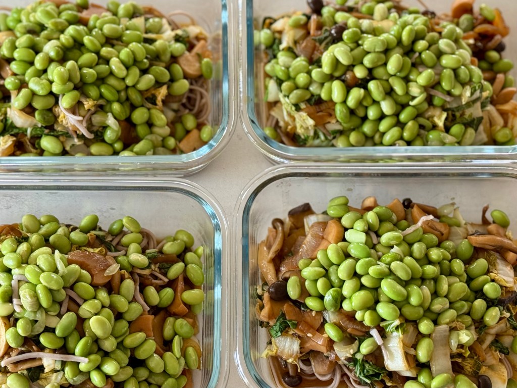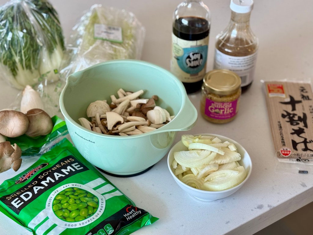 - Soba Stir Fry: Soba noodles, edamame, king oyster mushrooms, brown beech mushrooms, onion, garlic, Napa cabbage, and baby bok choy, tossed with Trader Joe’s soyaki sauce and reduced-sodium soy sauce