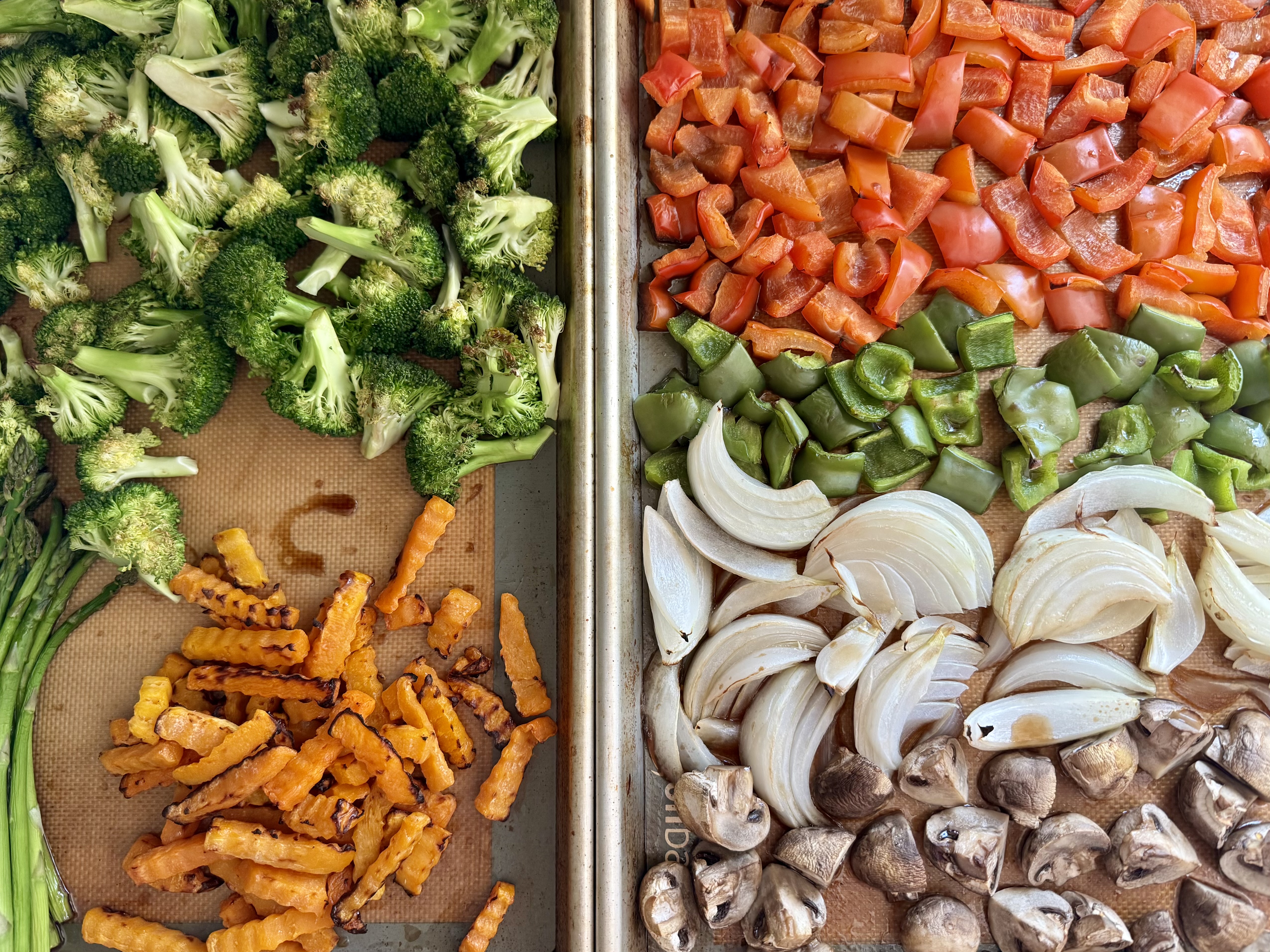 For the chicken, I marinated it in Greek yogurt with curry powder, lemon juice, Dijon mustard, dried basil, and Trader Joe’s umami seasoning. The veggies got a drizzle of liquid aminos and sesame oil (though in hindsight, I should have seasoned them a bit more). I roasted red and green bell peppers, onion, broccoli, button mushrooms, and asparagus, plus air-fried butternut squash zigzags—another Trader Joe’s find I couldn’t resist trying.